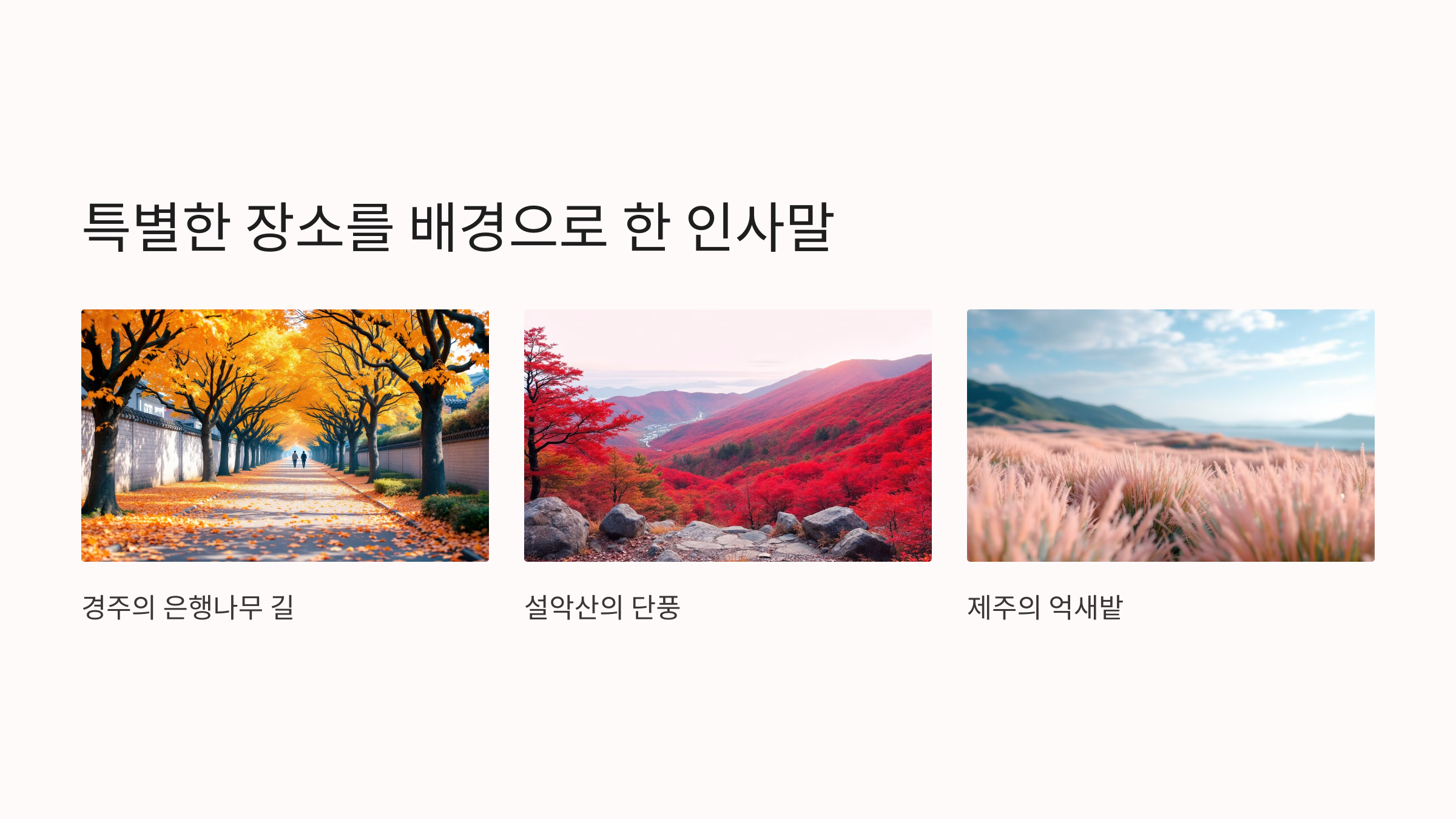 가을 여행지의 독특한 풍경을 강조하며 장소를 담아낸 인사말입니다.
