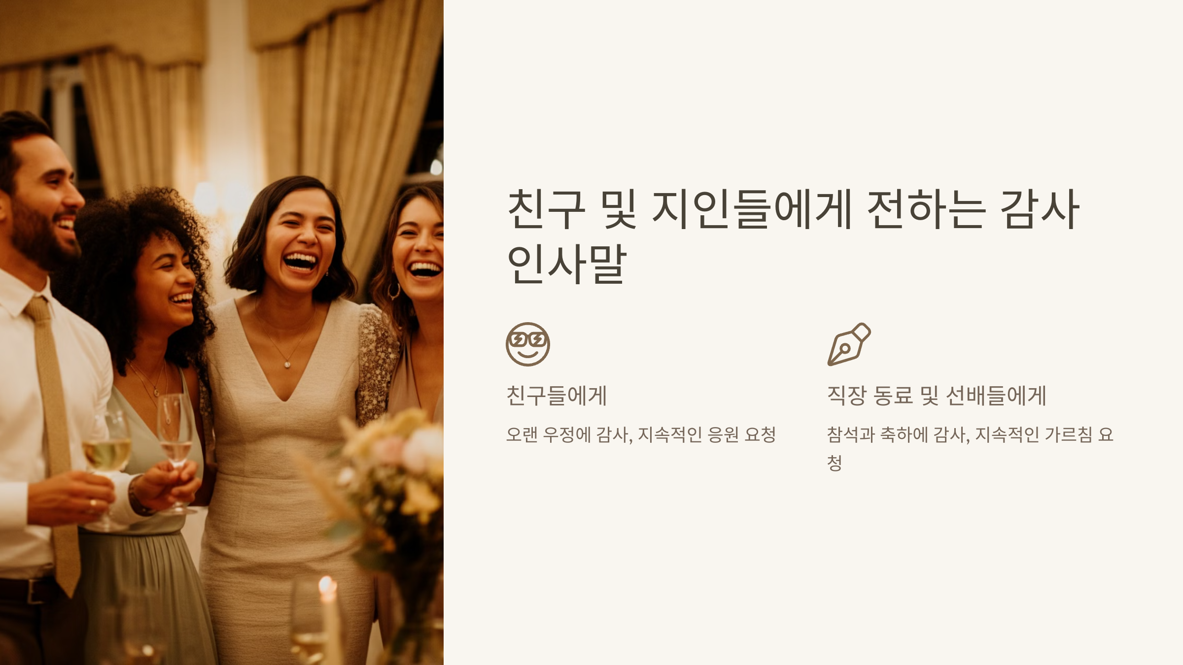 “오랜 시간 함께하며 축하해 준 친구들에게 고마운 마음을 전합니다. 여러분 덕분에 결혼식이 더 즐겁고 행복한 시간이 될 수 있었습니다. 앞으로도 변함없이 서로를 응원하며 좋은 추억 만들어 가길 바랍니다.”