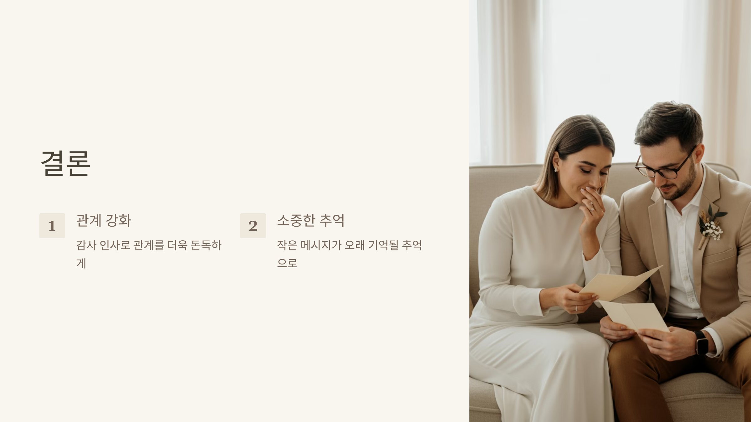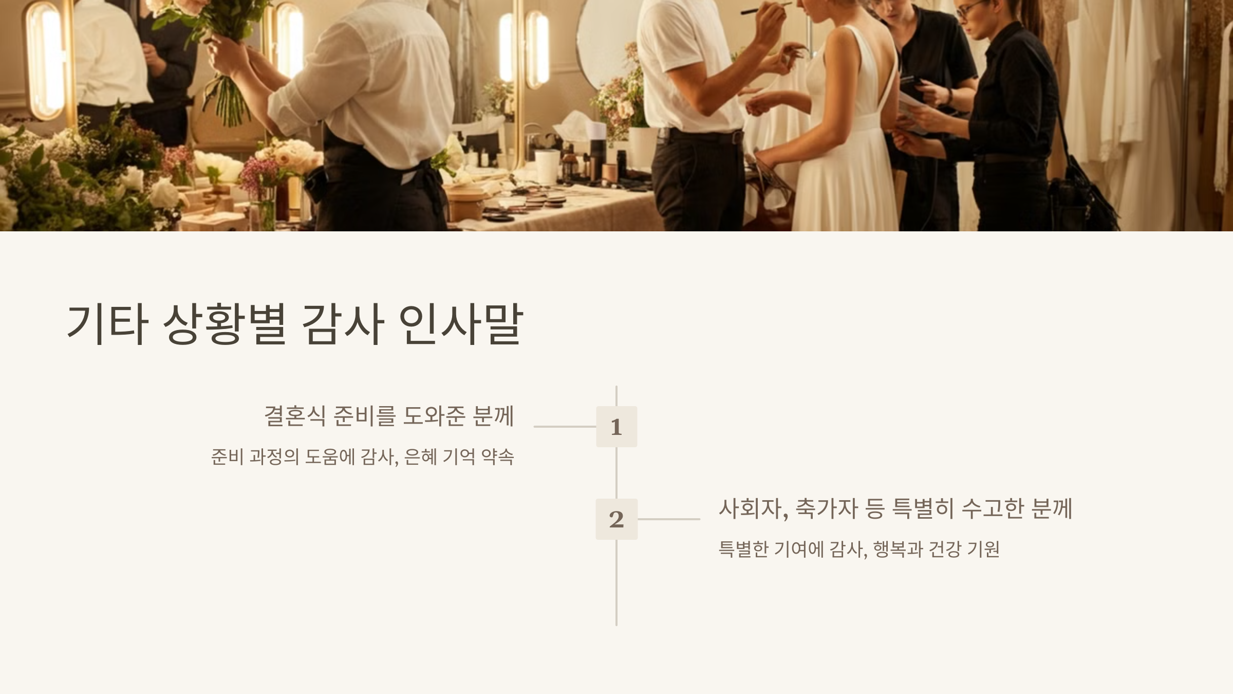 “저희 결혼식을 더욱 빛나게 해 주셔서 정말 감사합니다. 준비하느라 수고하신 모습이 떠오르며, 저희에게 특별한 추억을 선물해 주신 것에 진심으로 감사드립니다. 앞으로도 행복과 건강이 함께하시길 바랍니다.”