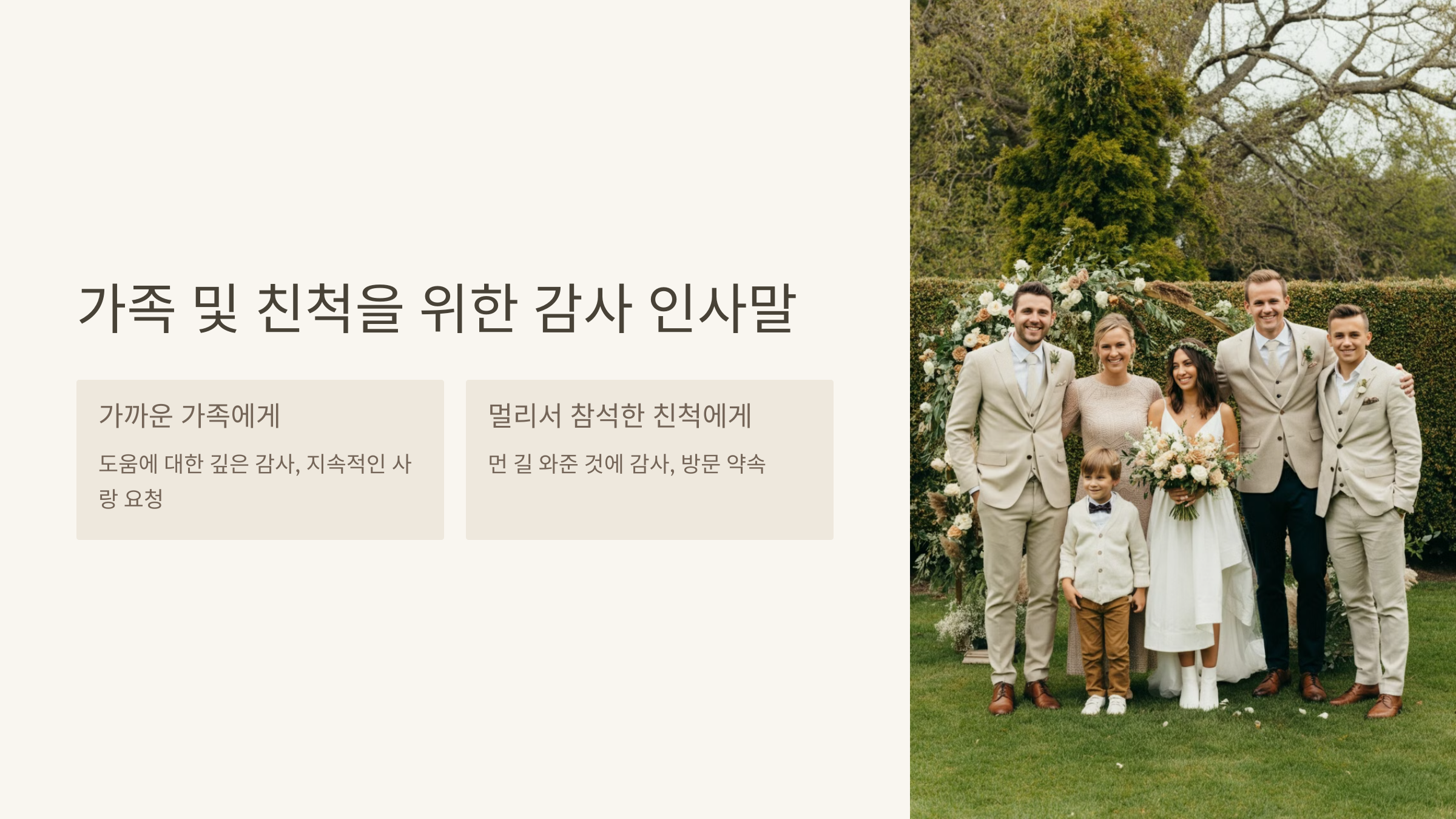 “먼 길까지 와주시고 함께 축하해 주셔서 정말 감사드립니다. 결혼 준비로 인사를 제대로 드리지 못해 죄송하지만, 보내주신 축하와 관심에 깊이 감사드립니다. 가까운 시일 내에 꼭 찾아뵙고 인사드리겠습니다.”