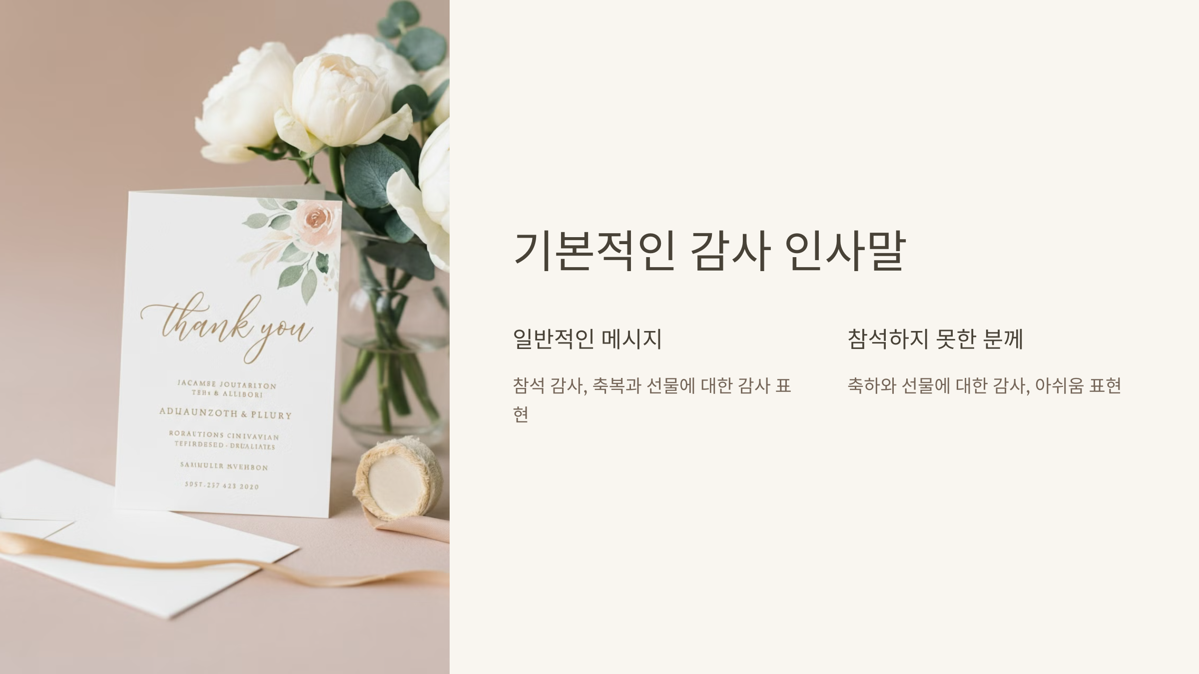 “안녕하세요, 저희 결혼식에 참석해 주셔서 진심으로 감사드립니다. 소중한 시간을 내어 함께 축하해 주시고, 따뜻한 축복과 선물을 보내주신 덕분에 저희의 특별한 날이 더욱 빛날 수 있었습니다. 앞으로도 두 사람의 새로운 시작을 응원해 주시길 부탁드리며, 감사한 마음을 전합니다.”