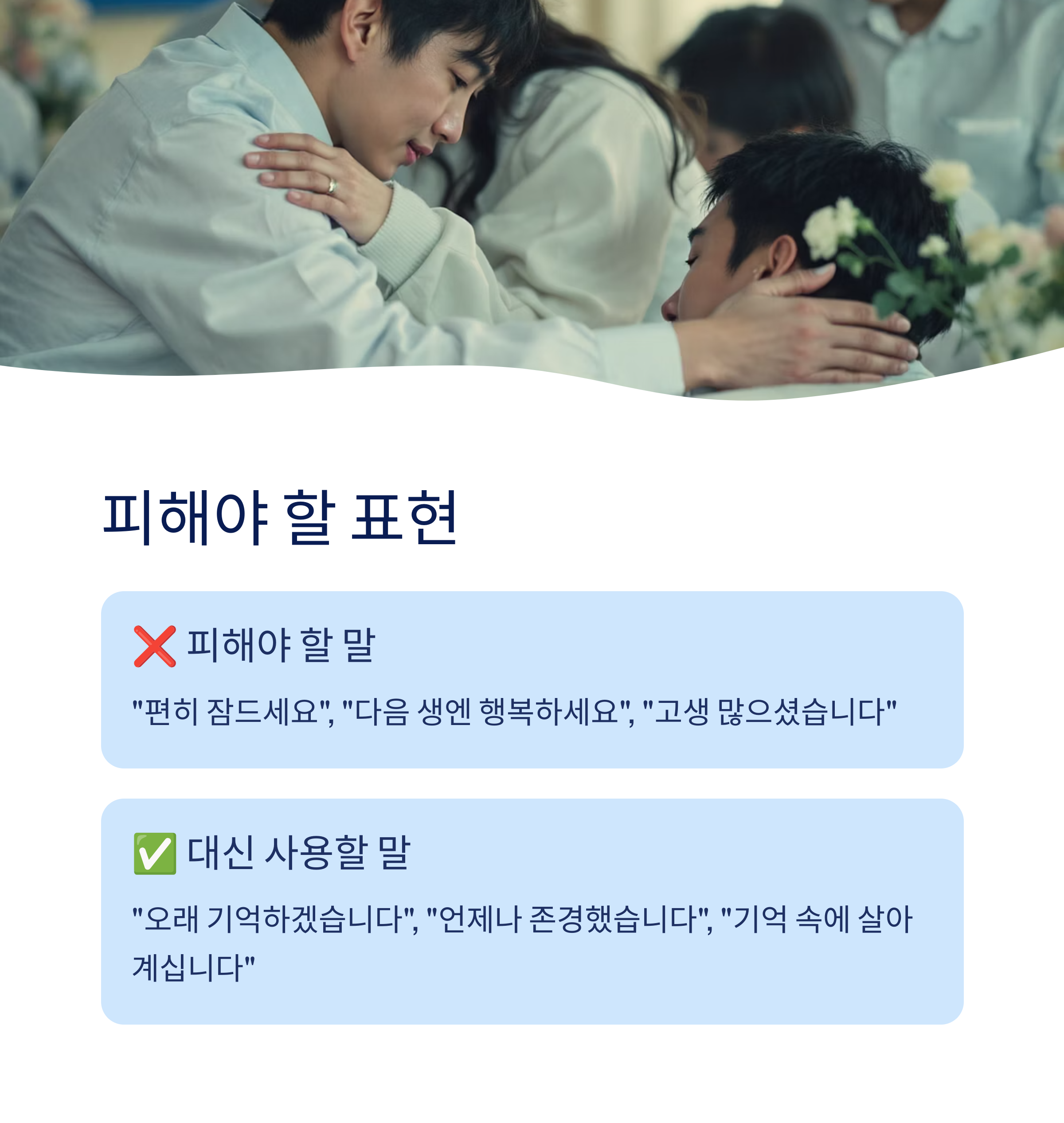 • ❌ “편히 잠드세요”, “다음 생엔 행복하세요”