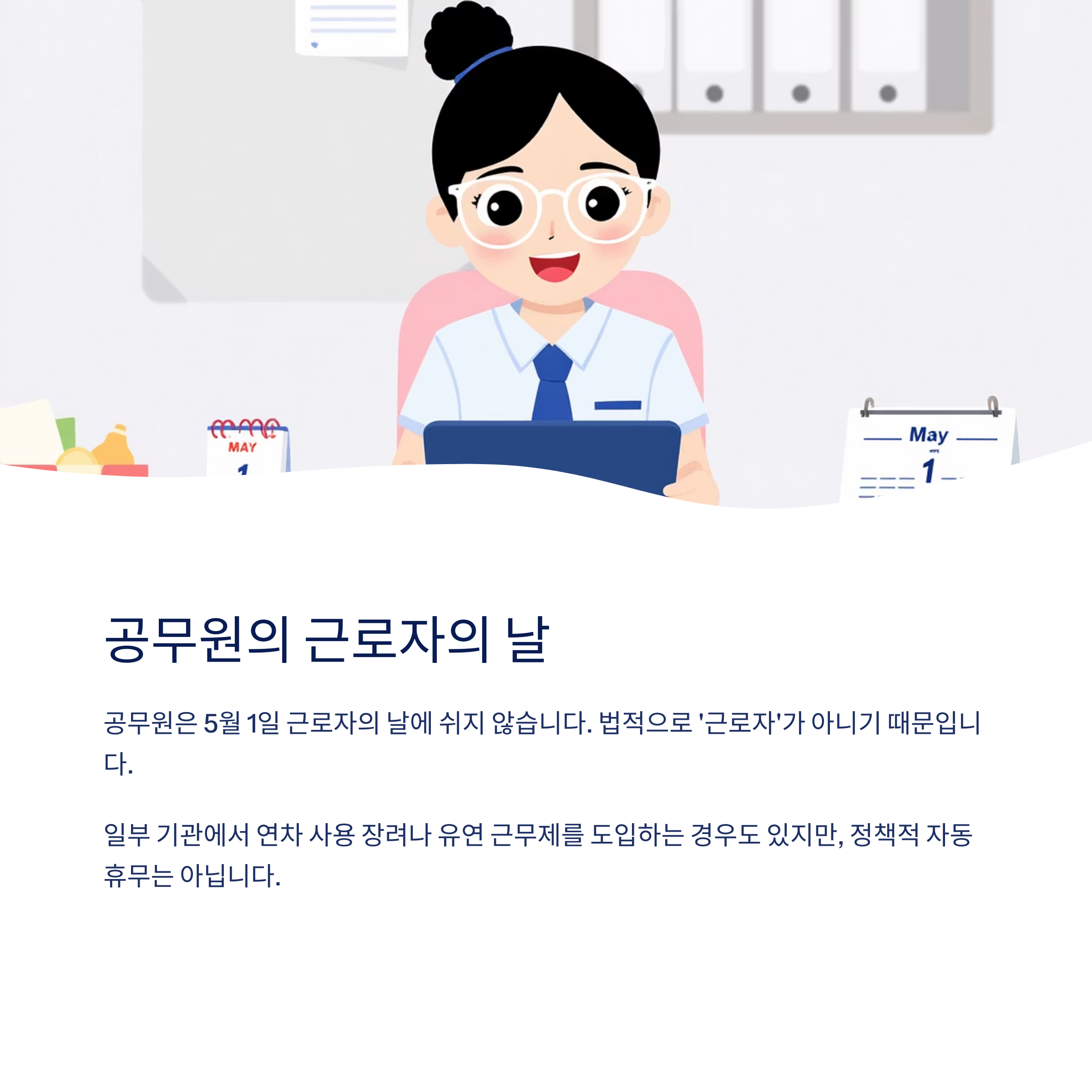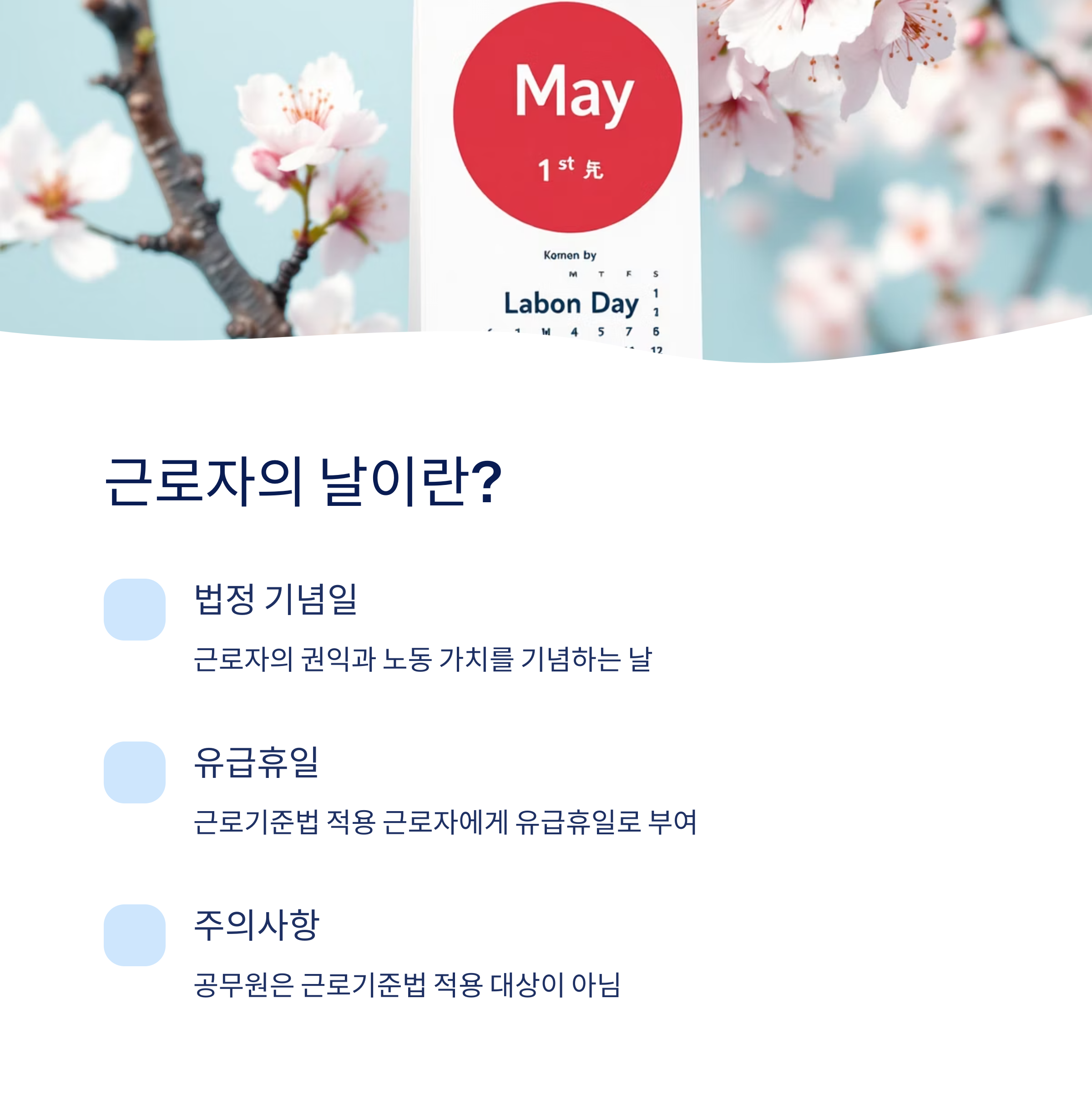 5월 1일은 ‘근로자의 날’로서 많은 직장인들이 유급휴일을 누리는 날입니다. 하지만 매년 이맘때쯤이면 “공무원도 근로자의 날에 쉴까?”라는 질문이 빠지지 않죠.