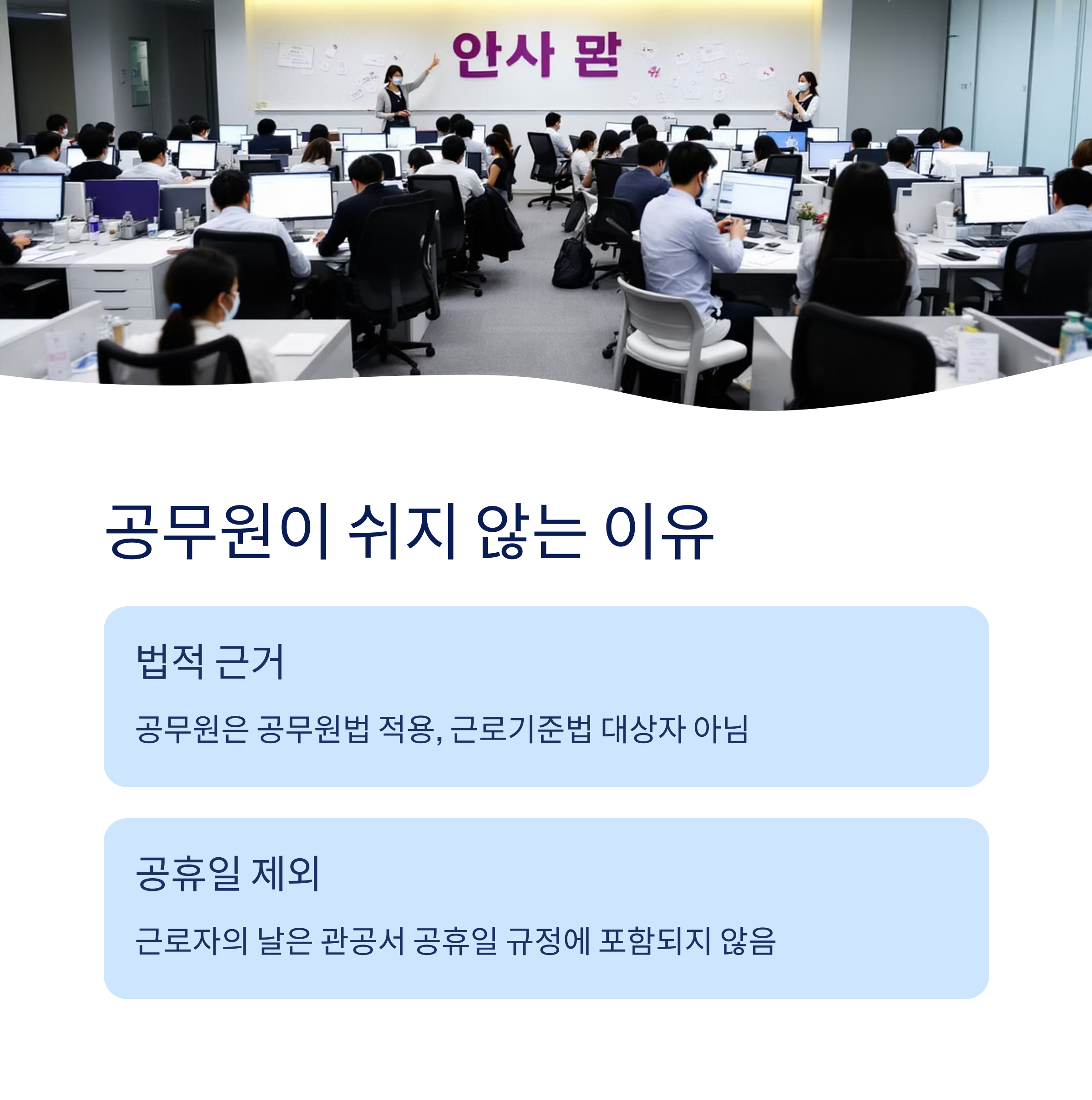 공무원은 공무원법의 적용을 받으며, 민간기업 직원들과 달리 근로기준법의 대상자가 아닙니다.