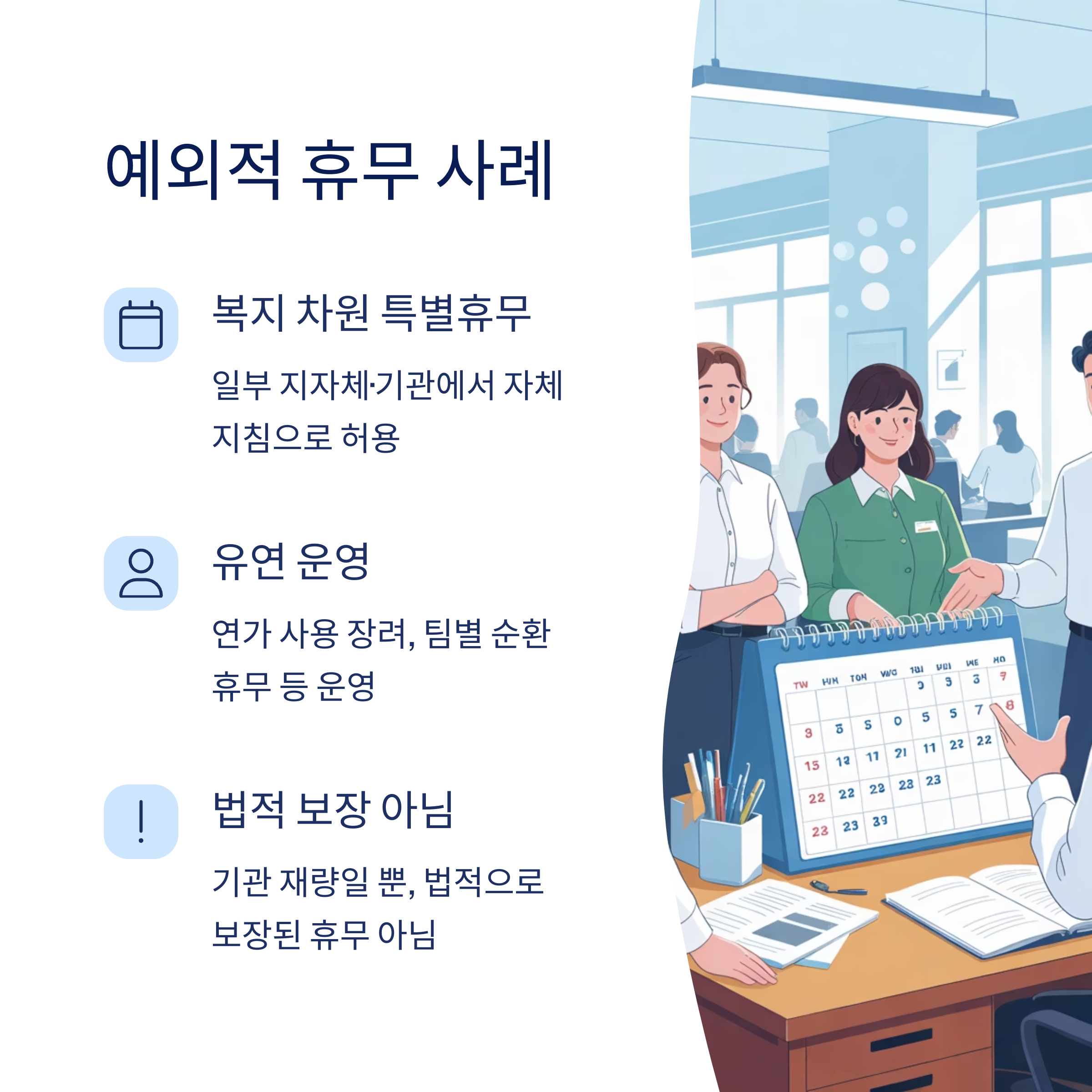 그러나 이 경우에도 이는 기관의 재량일 뿐, 법적으로 보장된 휴무는 아닙니다.