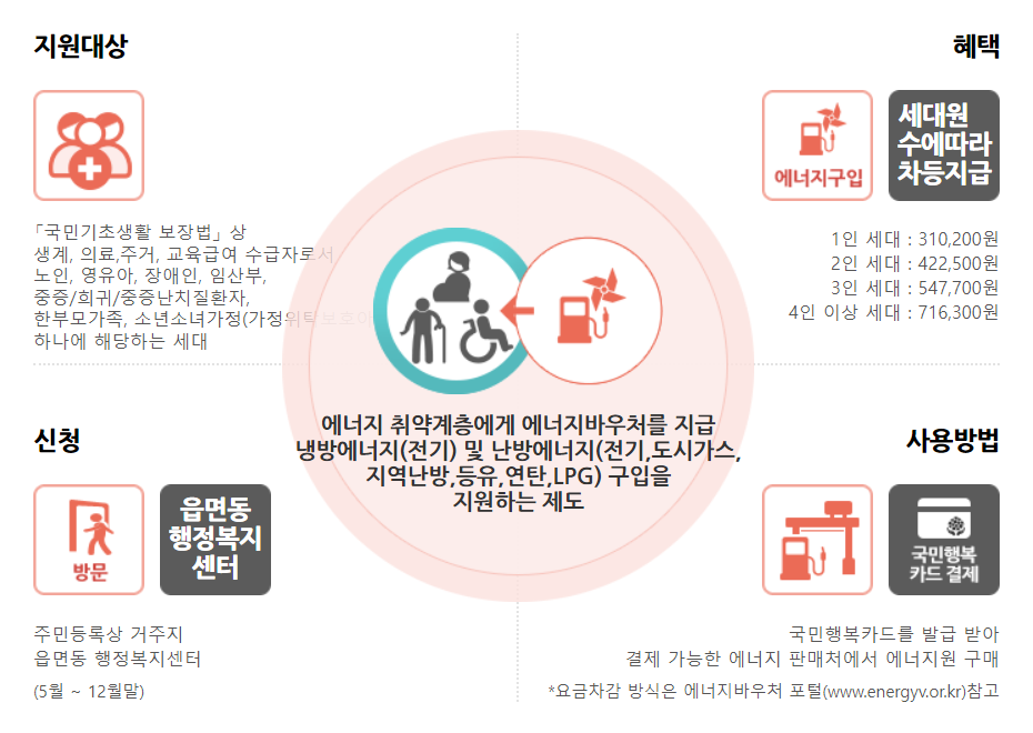 겨울철 난방비나 여름철 냉방비 등 에너지 비용이 크게 증가할 때, 저소득 가구를 대상으로 전기, 가스, 난방비 등을 지원하는 프로그램입니다. 이를 통해 모든 가정이 계절에 관계없이 쾌적하고 건강하게 지낼 수 있습니다.