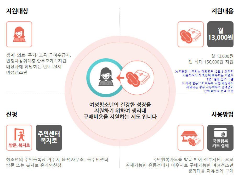 저소득 가정의 여성 및 청소년을 대상으로 생리대 바우처를 지원합니다. 기본적인 위생 용품을 경제적인 부담 없이 이용할 수 있도록 돕는 중요한 프로그램입니다.