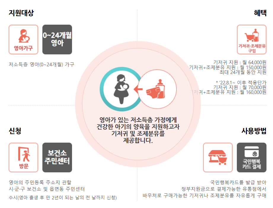 아이를 키우는 데 필수적인 기저귀와 조제분유 등의 비용을 바우처로 지원합니다. 특히 경제적으로 어려움을 겪는 가정에 큰 도움이 되는 프로그램입니다.