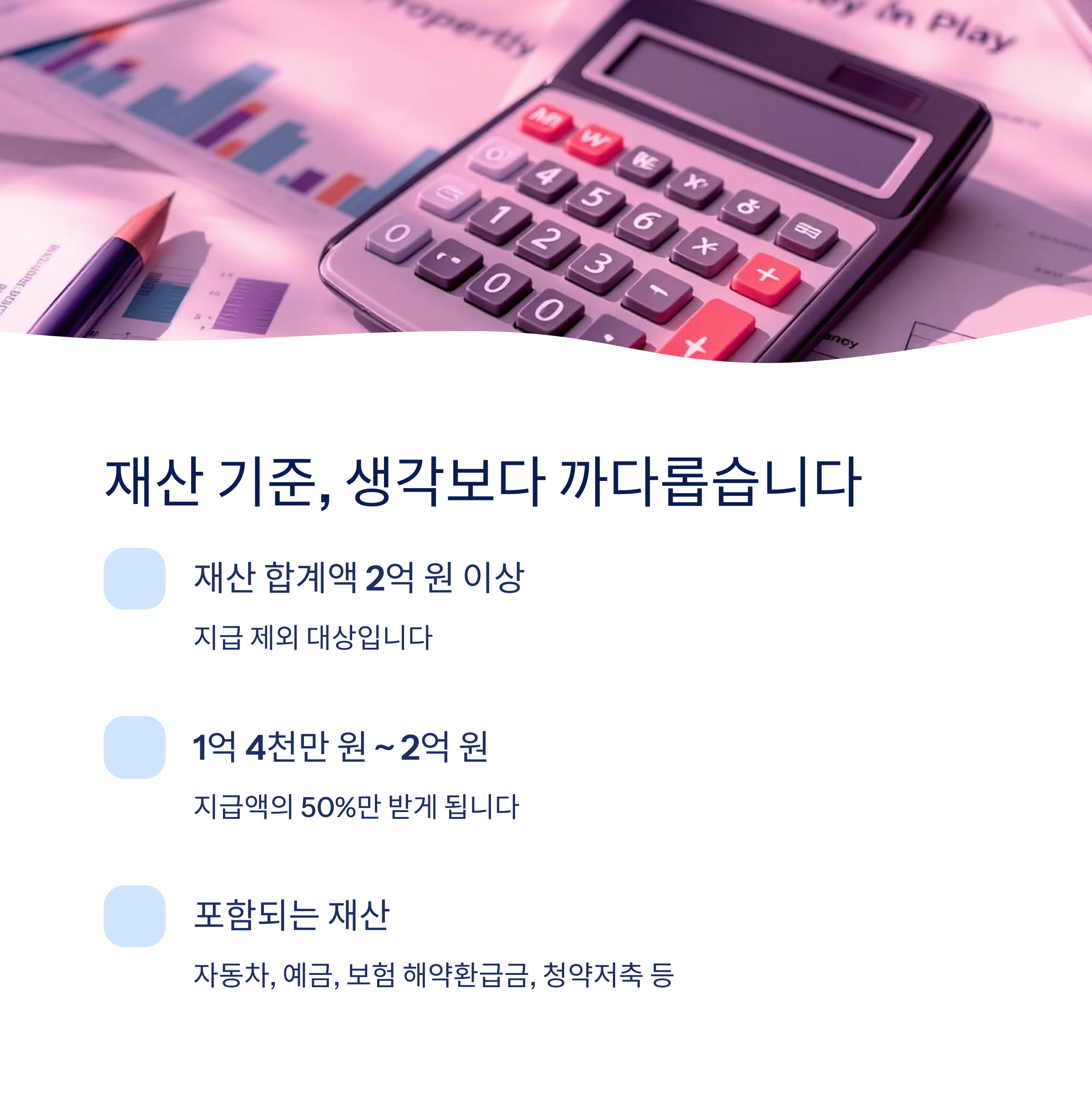 - 재산 합계액 2억 원 이상이면 지급 제외