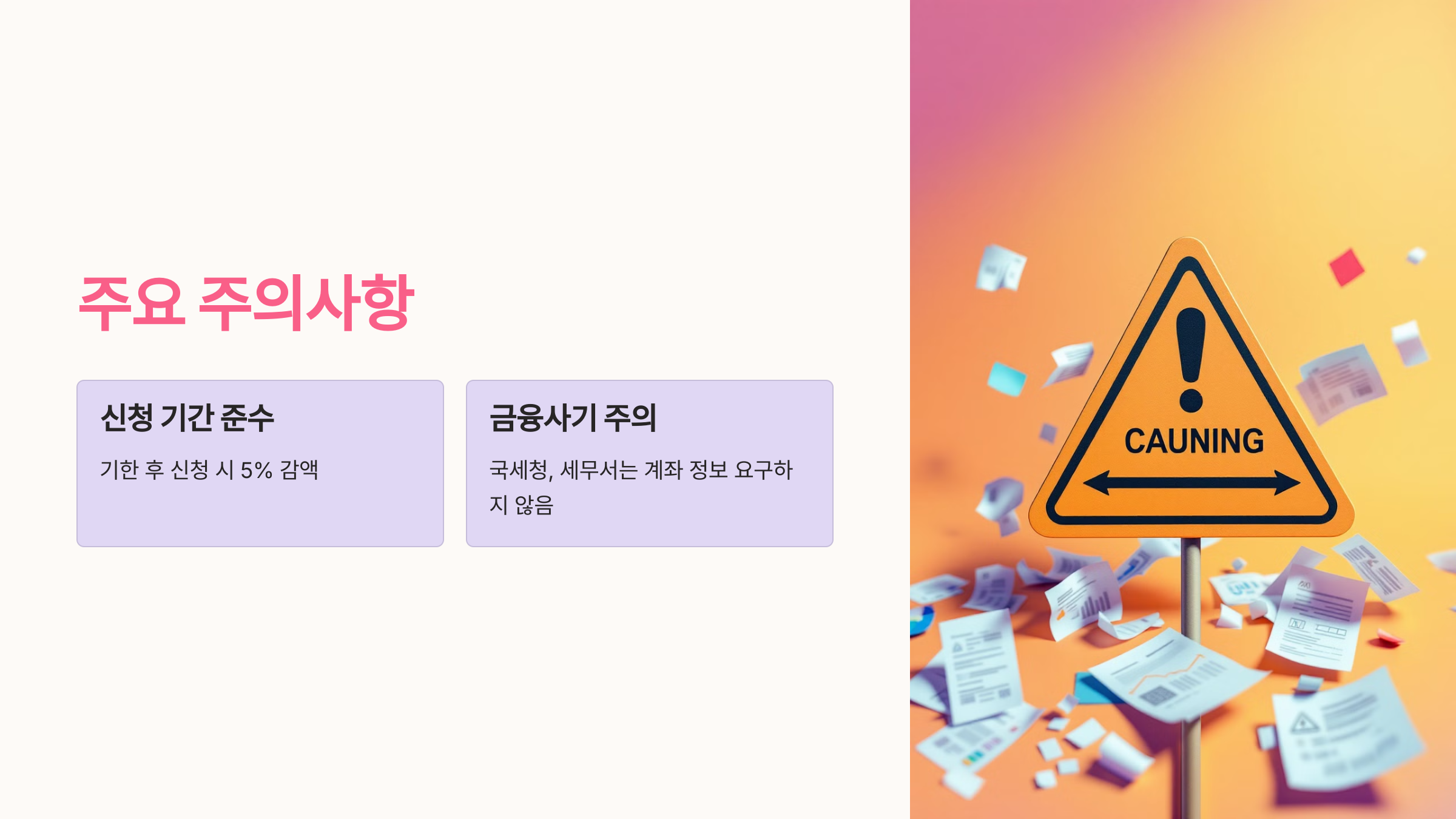 - 국세청이나 세무서 직원은 금품이나 계좌 비밀번호 등을 요구하지 않으니, 사칭한 금융사기에 유의하시기 바랍니다.