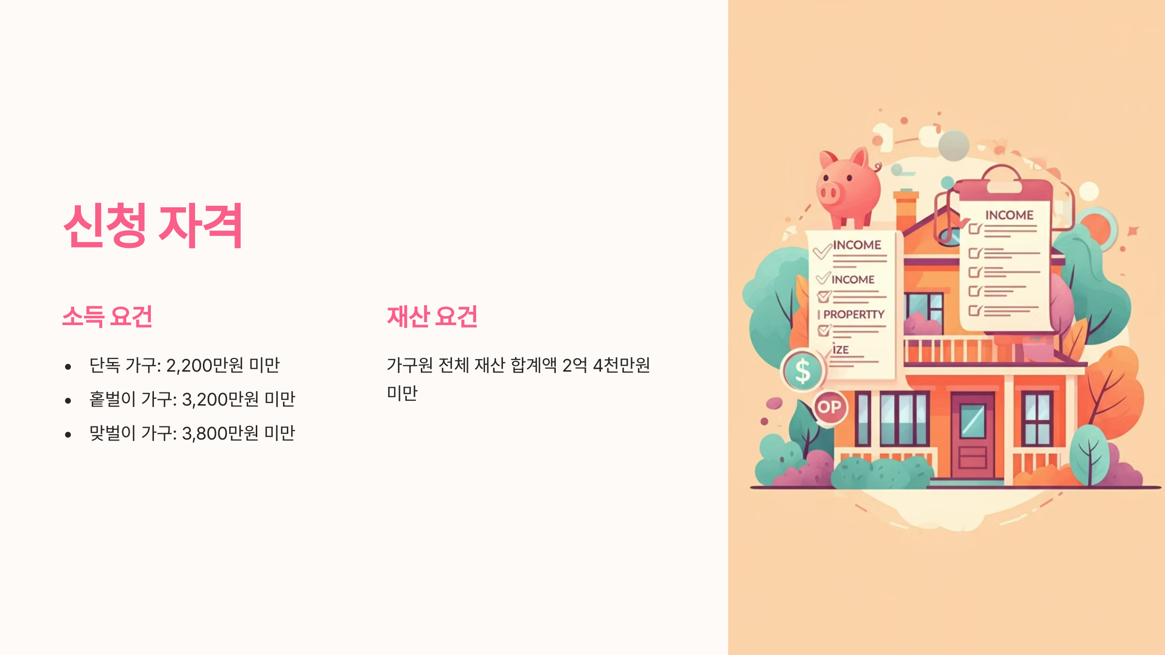 - 소득 요건: 2023년 부부 합산 연간 총소득이 단독 가구는 2,200만 원 미만, 홑벌이 가구는 3,200만 원 미만, 맞벌이 가구는 3,800만 원 미만이어야 합니다.