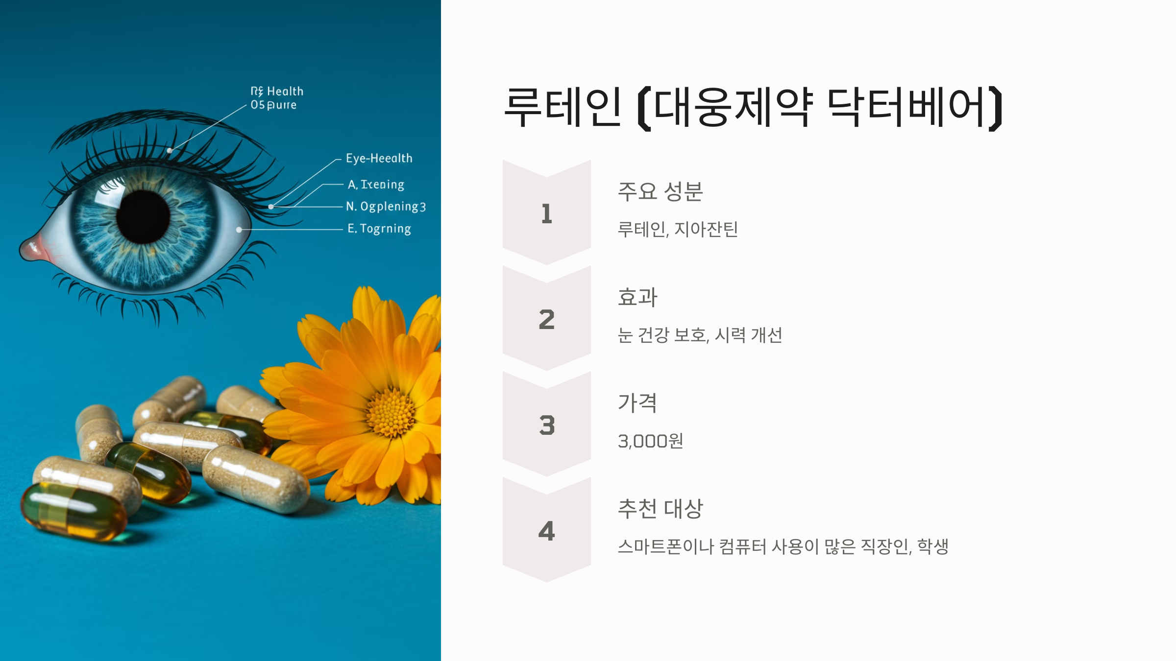 눈 건강을 위한 필수 영양소인 루테인을 함유한 제품으로, 장시간 화면을 보는 현대인들에게 유용합니다. 저렴한 가격으로 눈 건강을 관리할 수 있어 가성비가 뛰어납니다.