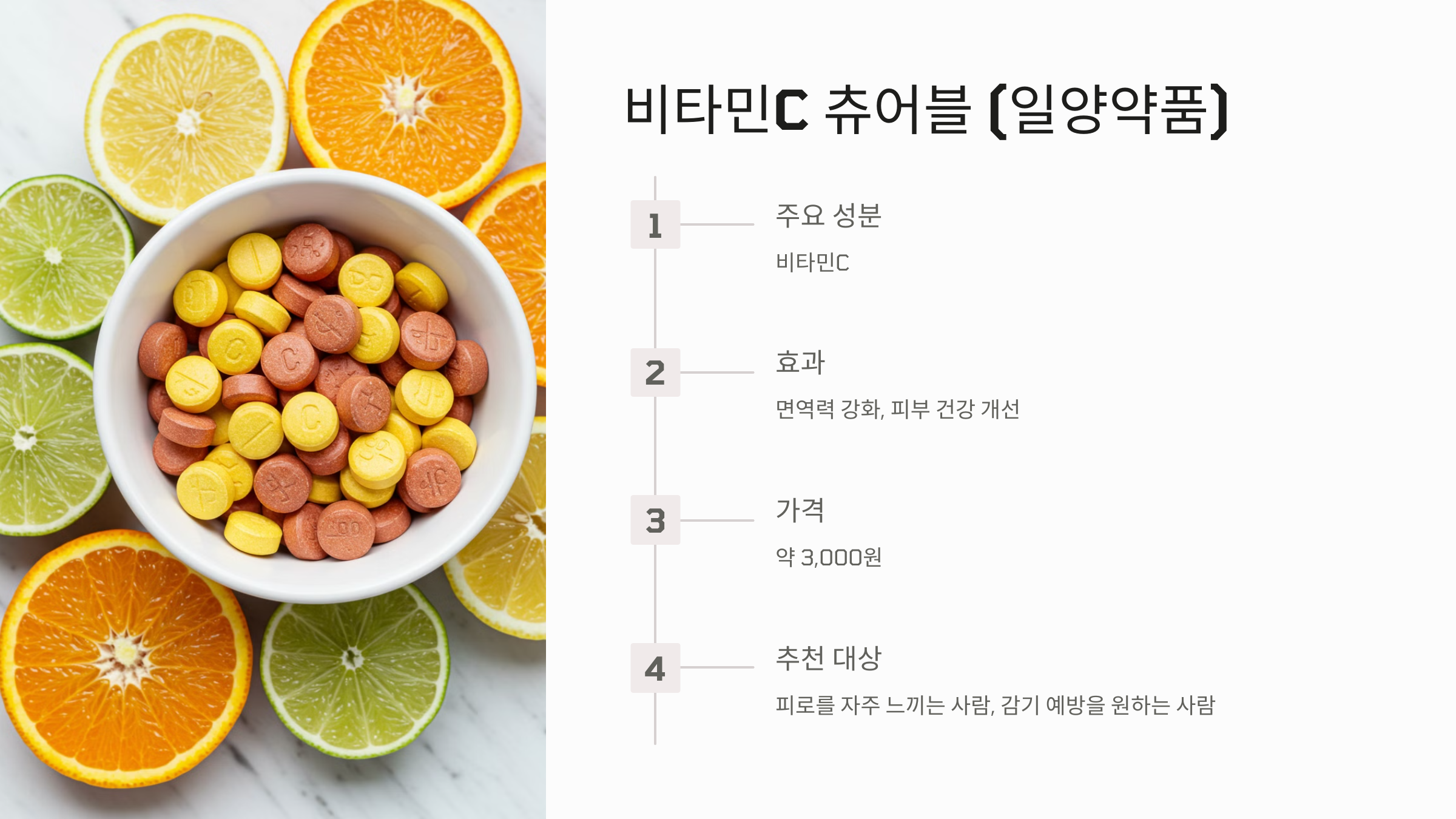 비타민C는 면역력 강화와 피부 건강에 필수적인 영양소로, 쉽게 섭취할 수 있는 츄어블 형태로 제공됩니다. 일양약품에서 제조한 제품이므로 품질도 믿을 만합니다.