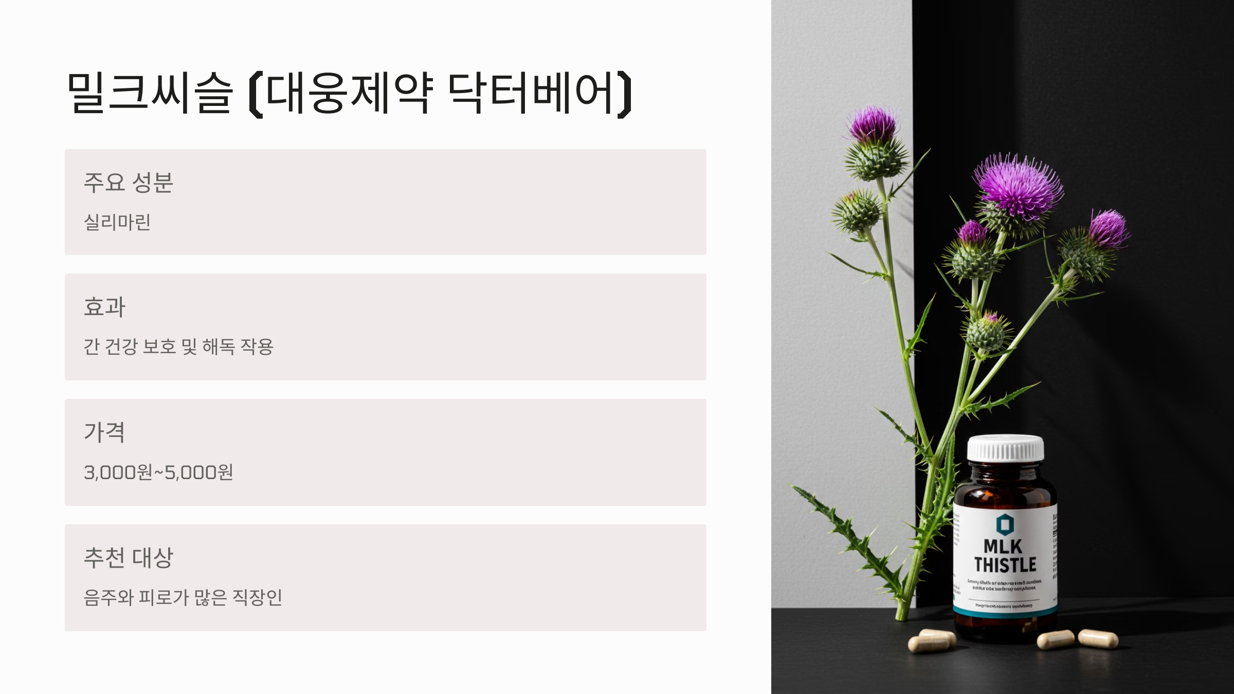 밀크씨슬은 간 건강에 도움을 주는 대표적인 영양제로, 술을 자주 마시거나 피로가 누적된 사람들에게 적합합니다. 다이소 제품은 대웅제약에서 제조하여 품질 신뢰도가 높지만, 약국에서 판매되는 고함량 제품보다는 다소 낮은 실리마린 함량을 포함하고 있습니다.