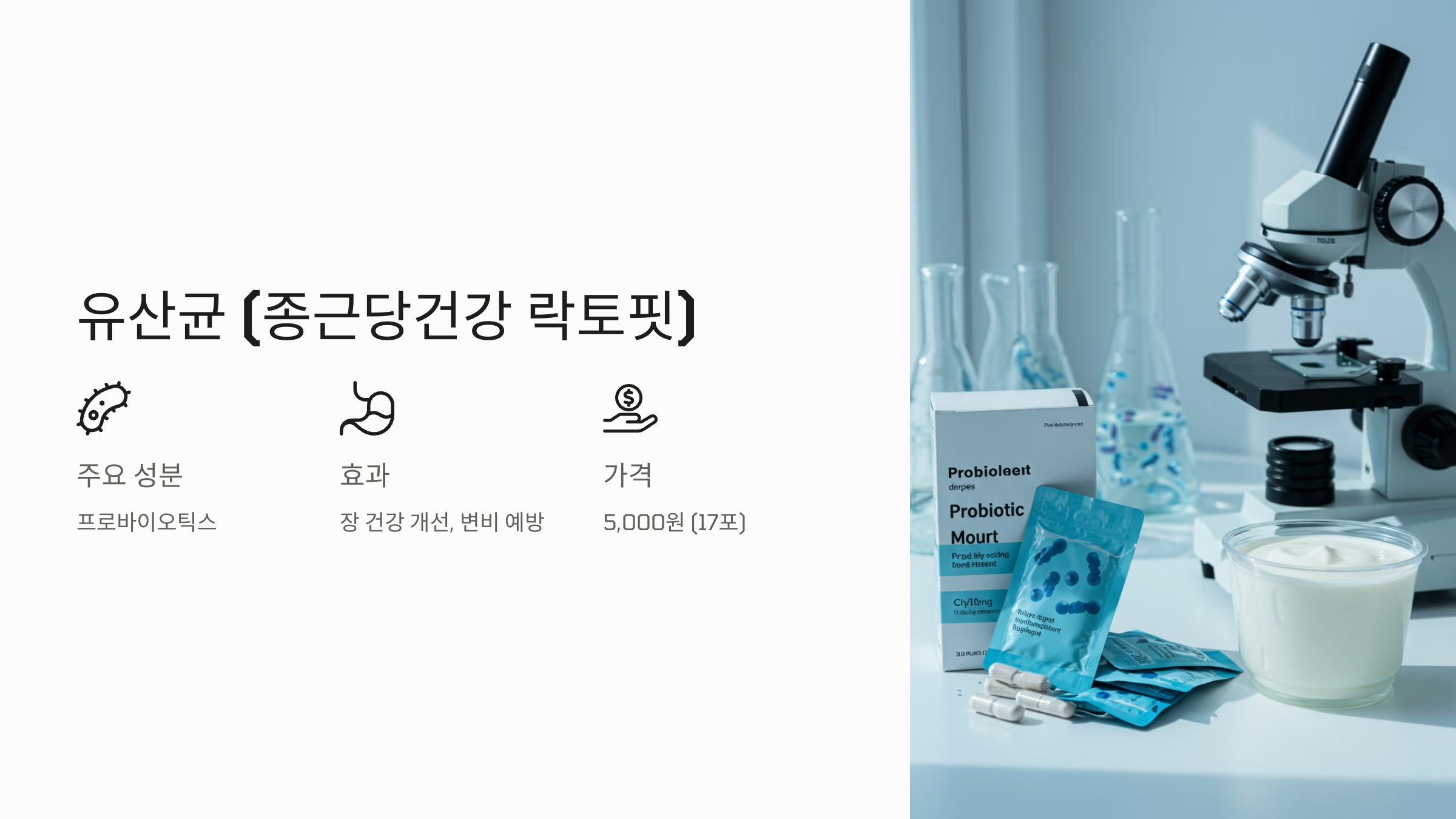 장 건강을 위한 유산균 제품으로, 종근당건강의 인기 브랜드인 '락토핏'이 다이소에서도 판매됩니다. 합리적인 가격에 장 건강을 관리할 수 있어 인기가 높습니다.