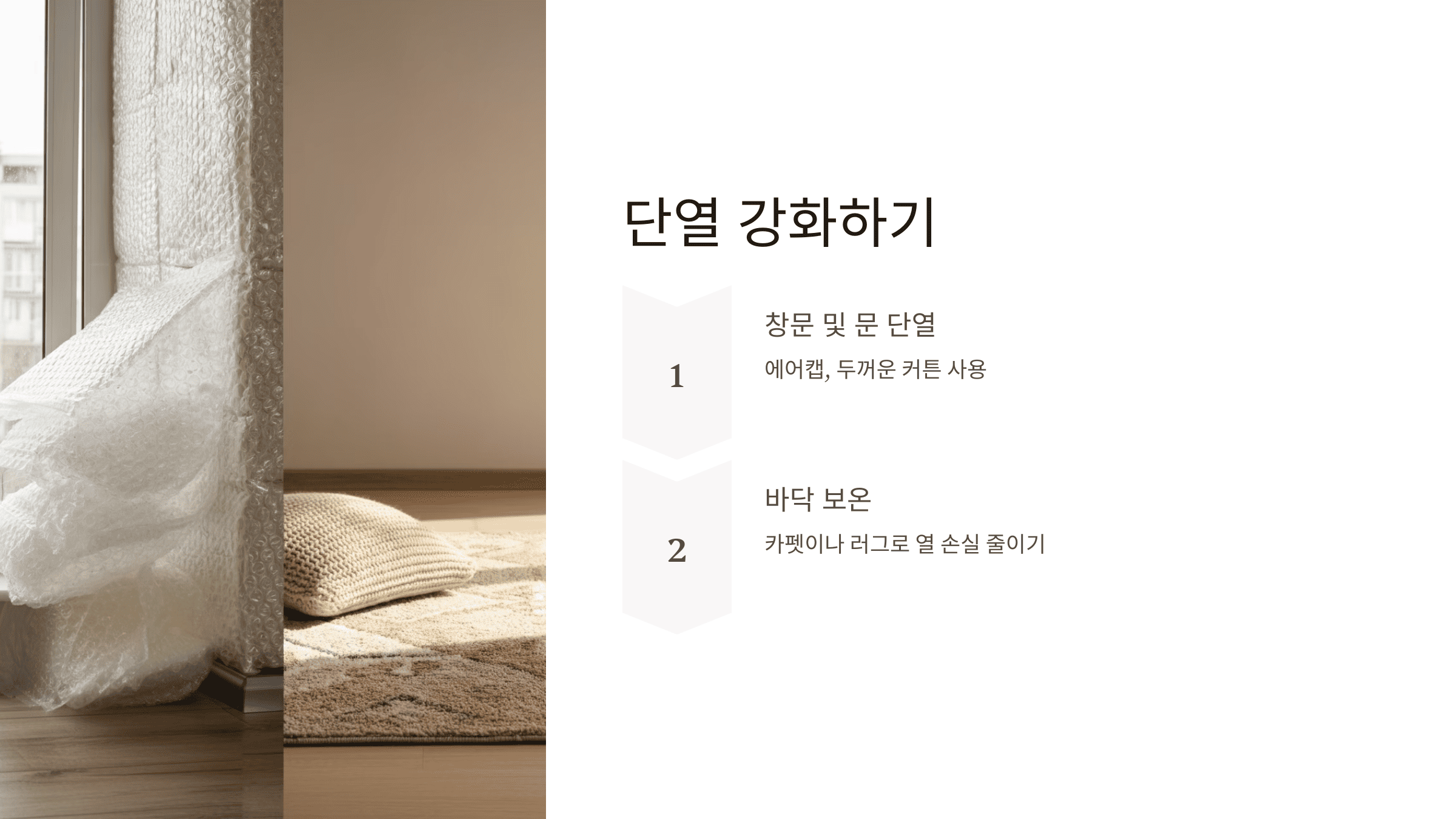 - 바닥 보온: 카펫이나 러그를 깔아 바닥을 통한 열 손실을 줄이세요