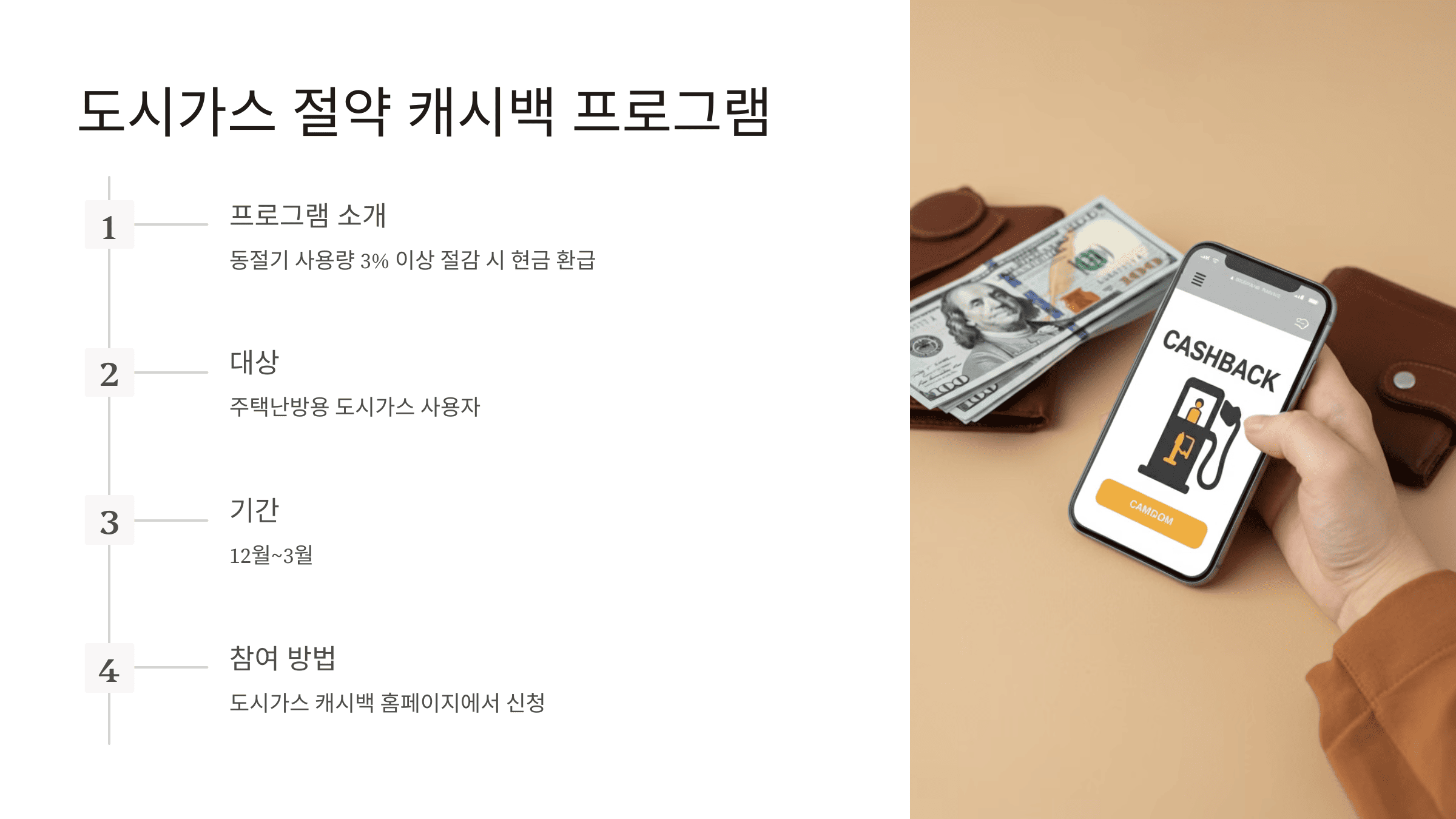 - 프로그램 소개: 주택난방용 도시가스 사용자가 동절기(12~3월) 동안 전년도 대비 사용량을 3% 이상 절감하면, 절감량에 따라 현금으로 돌려주는 제도입니다.