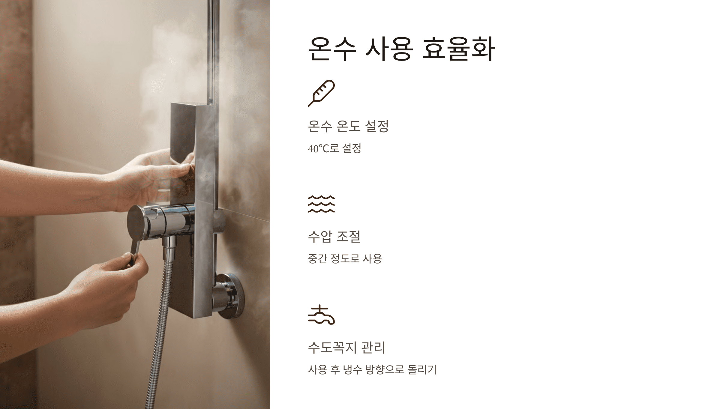 - 수도꼭지 관리: 사용 후 수도꼭지를 냉수 방향으로 돌려놓으면 불필요한 보일러 가동을 방지할 수 있습니다.