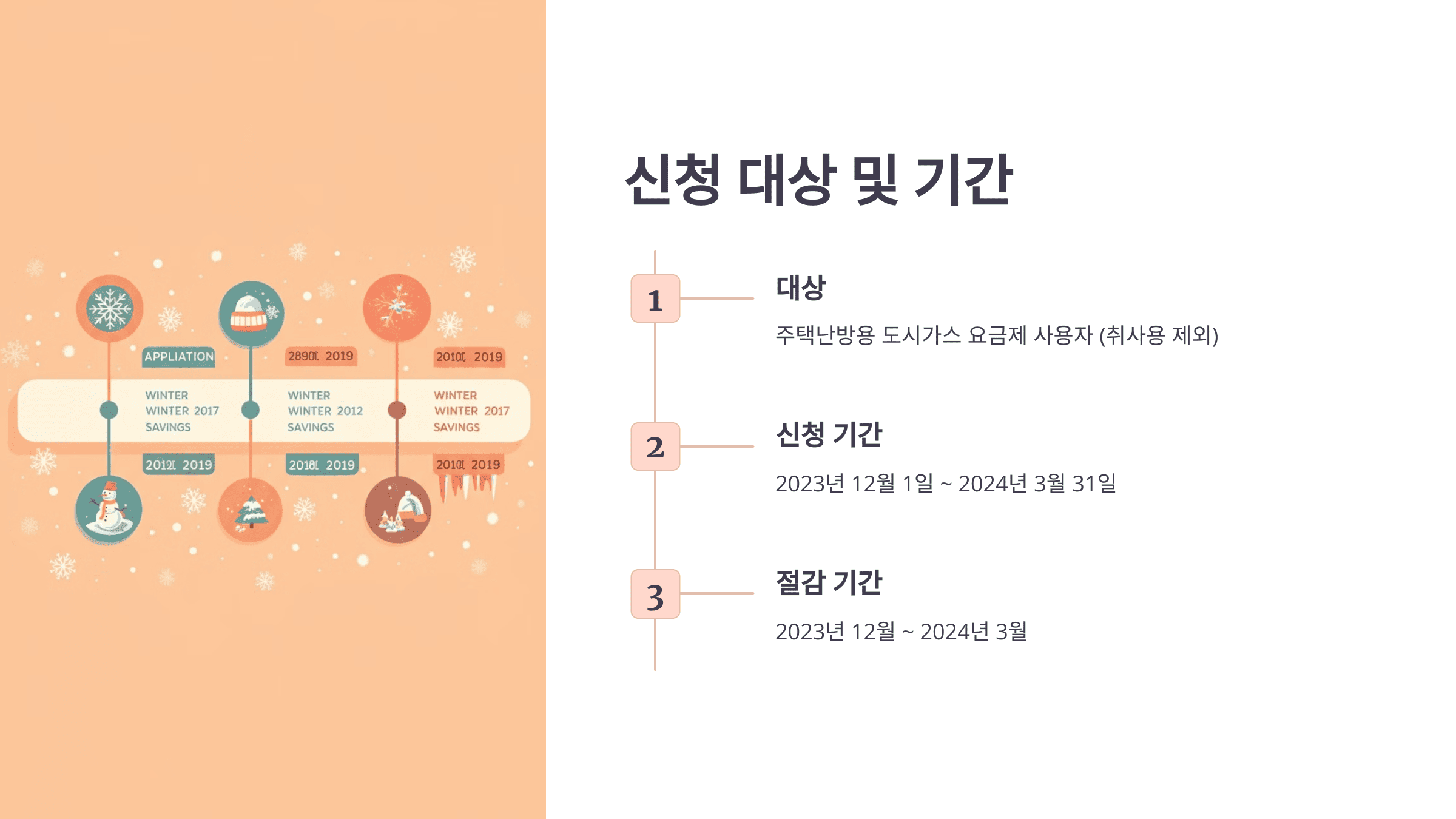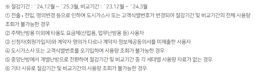 - 대상: 주택난방용 도시가스 요금제를 사용하는 개인 및 단체 사용자(취사용 제외)