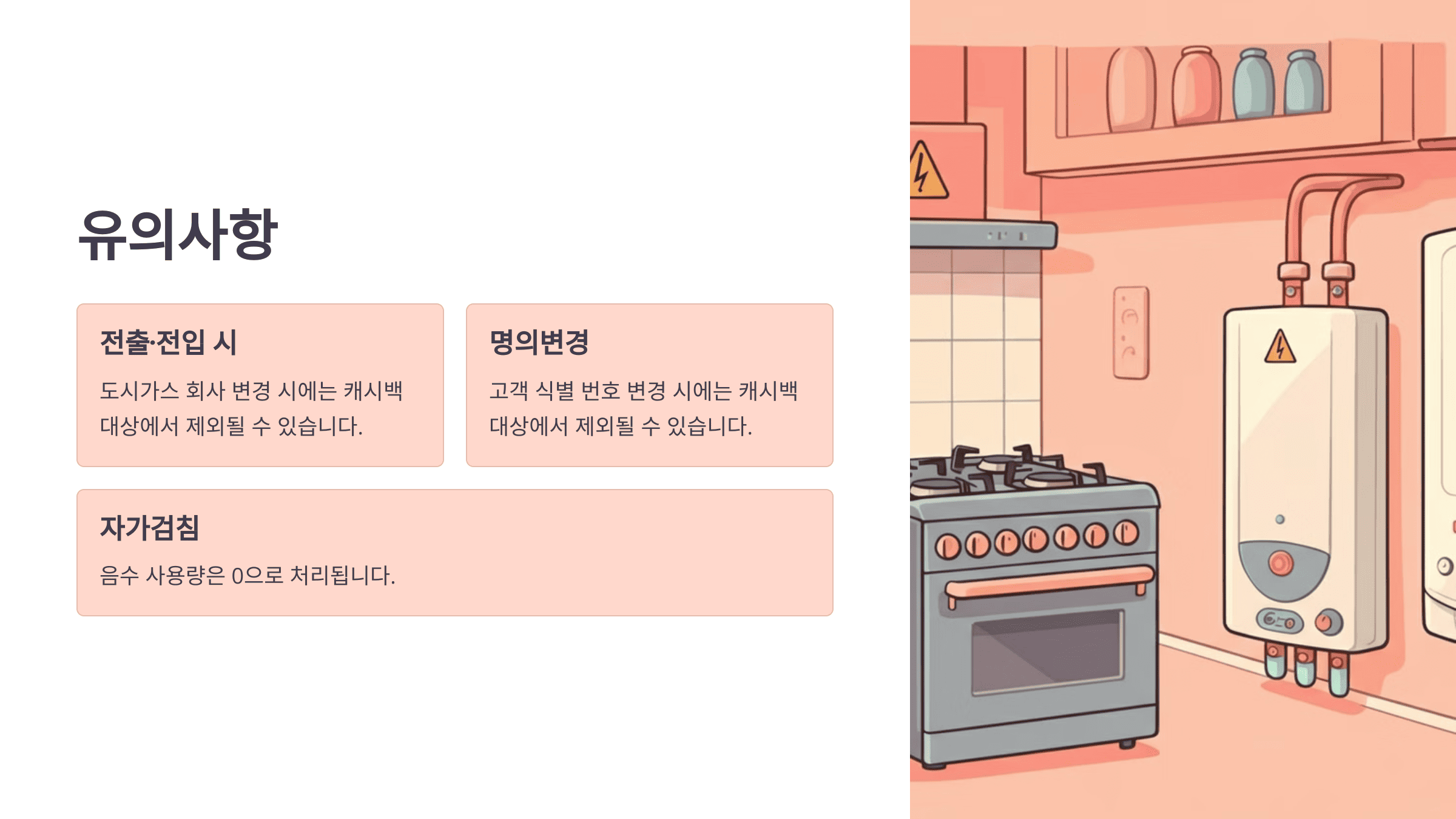 - 전출·전입, 명의변경 등으로 도시가스사나 고객식별번호가 변경되면 캐시백 지급 대상에서 제외될 수 있습니다.