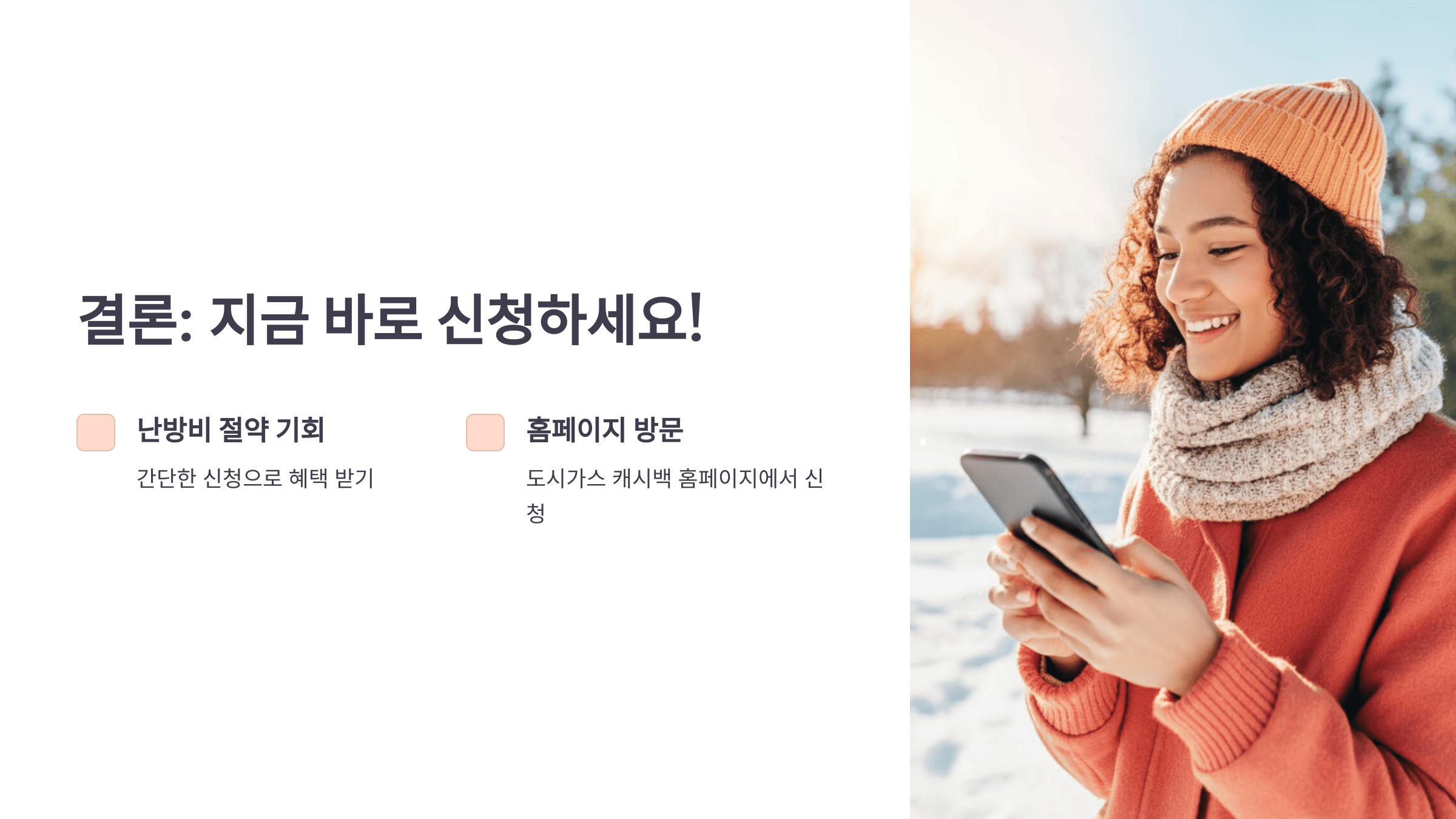 도시가스 캐시백 프로그램은 가정의 난방비 부담을 줄일 수 있는 좋은 기회입니다. 간단한 신청 절차를 통해 혜택을 받을 수 있으니, 지금 바로 도시가스 캐시백 홈페이지를 방문하여 신청하시기 바랍니다.