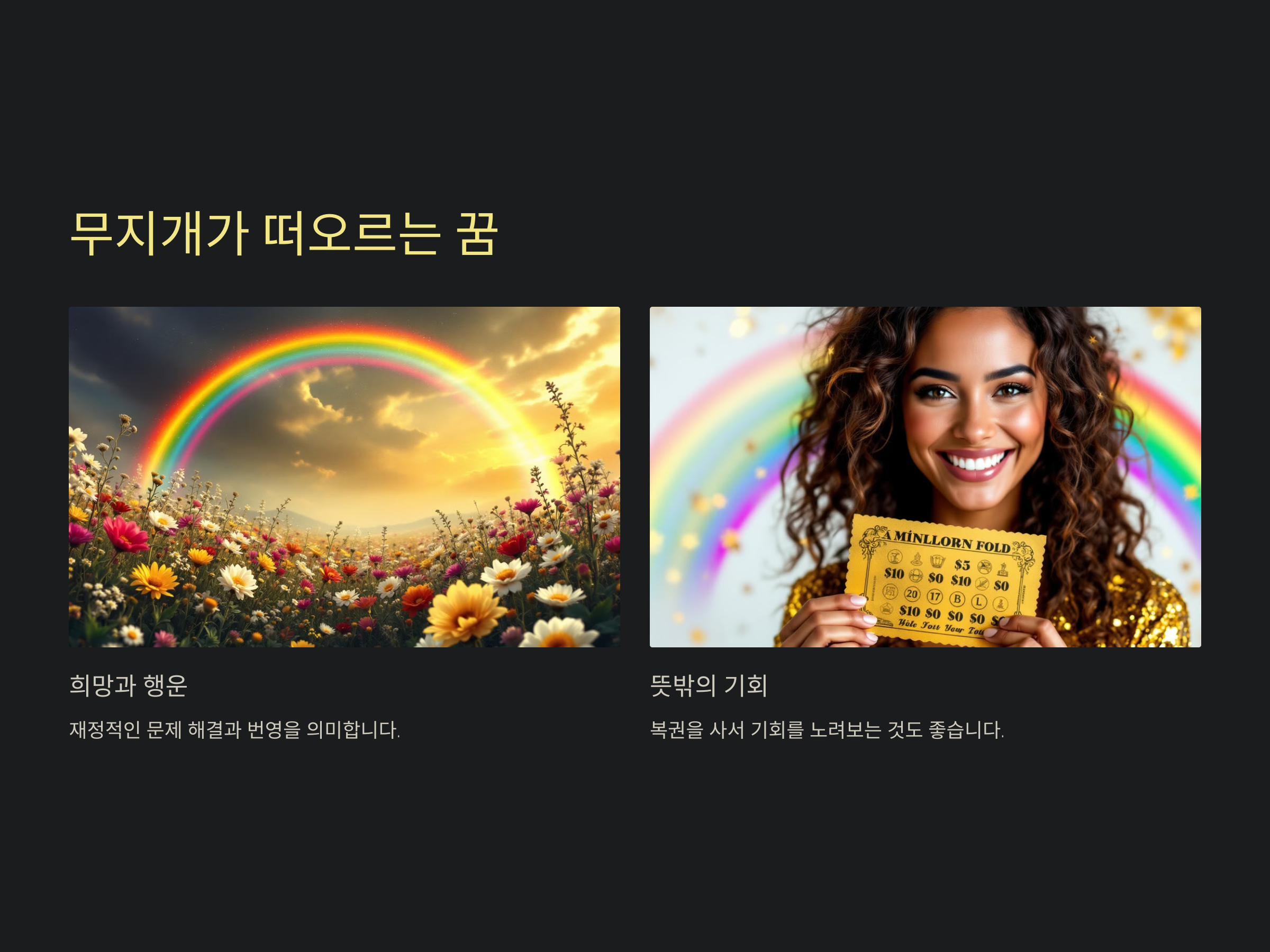 무지개는 희망과 행운을 상징하며, 특히 재정적인 문제 해결과 번영을 의미하는 꿈입니다. 무지개가 선명하고 길게 떠오를수록 큰 행운이 찾아올 가능성이 높습니다.