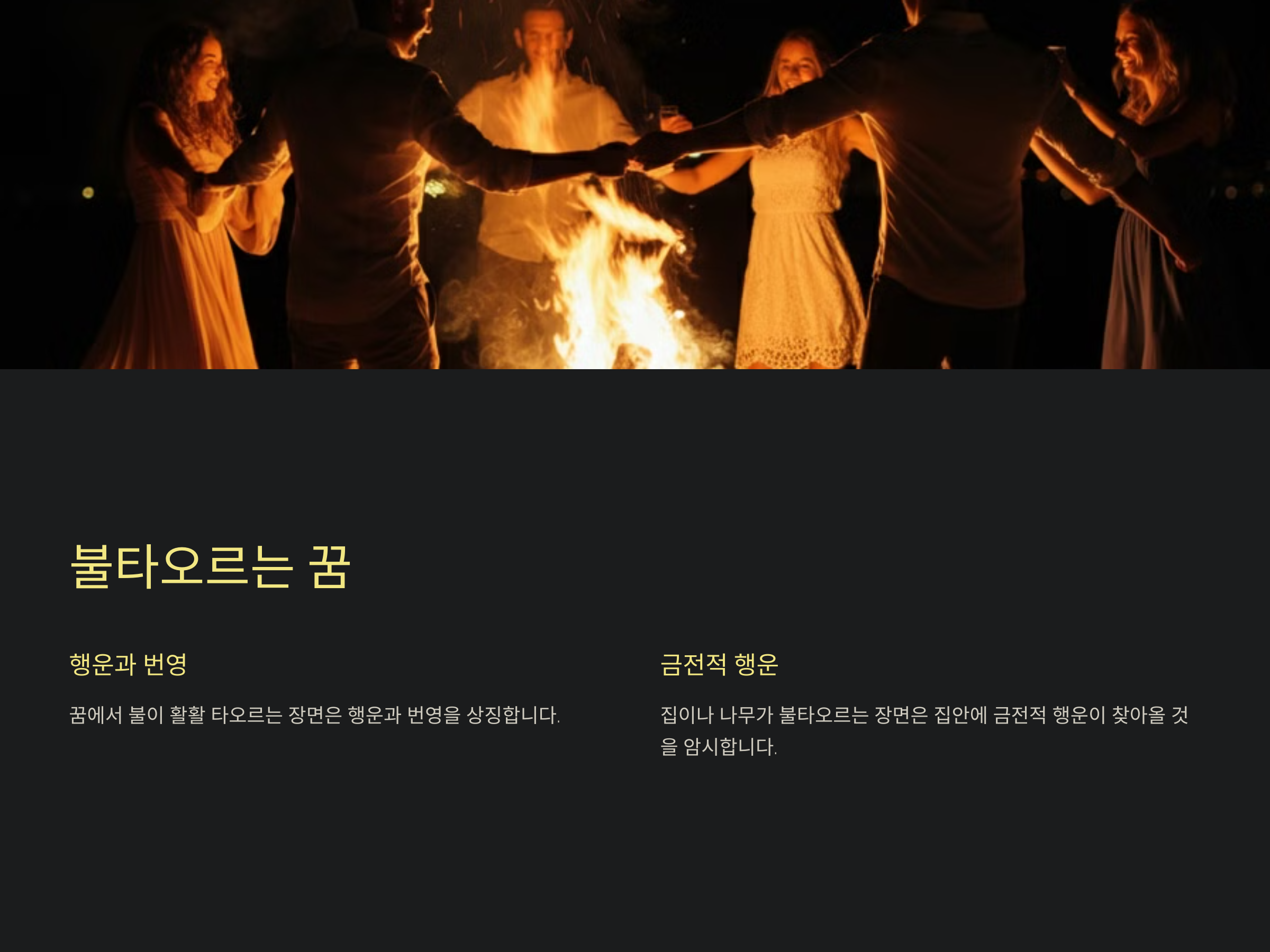 꿈에서 불이 활활 타오르는 장면은 행운과 번영을 상징합니다. 특히 집이나 나무가 불타오르는 장면은 집안에 금전적 행운이 찾아올 것을 암시합니다.