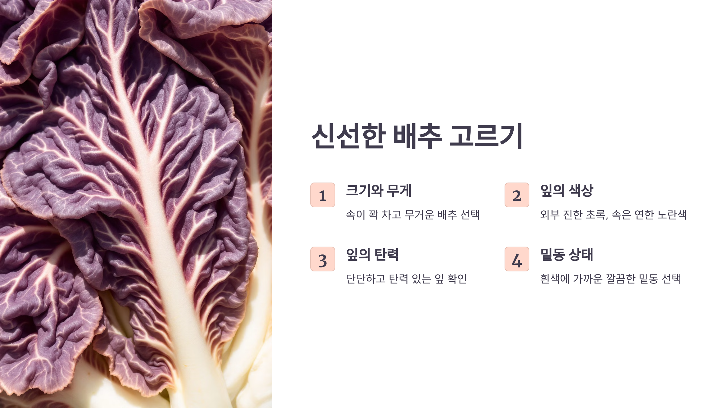 배추의 밑동 부분이 흰색에 가까우며 뿌리 끝이 깔끔하게 잘린 배추를 선택하세요. 밑동이 너무 갈색이거나 변색된 배추는 피하는 것이 좋습니다.