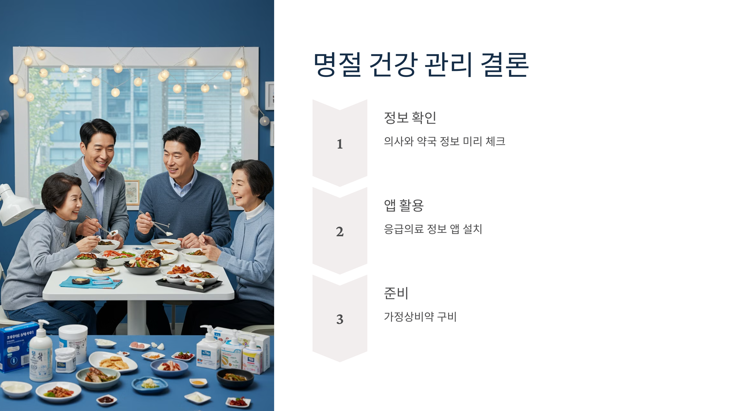 "명절은 사랑하는 가족과 시간을 보내는 소중한 날이지만, 건강이 뒷받침되지 않으면 즐길 수 없습니다. 미리 의사와 약국 정보를 확인하고 건강 관리를 위한 준비를 철저히 하세요. 응급의료 정보 앱을 활용하고, 가정상비약을 준비하면 갑작스러운 상황에도 침착하게 대처할 수 있습니다. 건강한 몸과 마음으로 명절을 더욱 뜻깊게 보내시길 바랍니다."