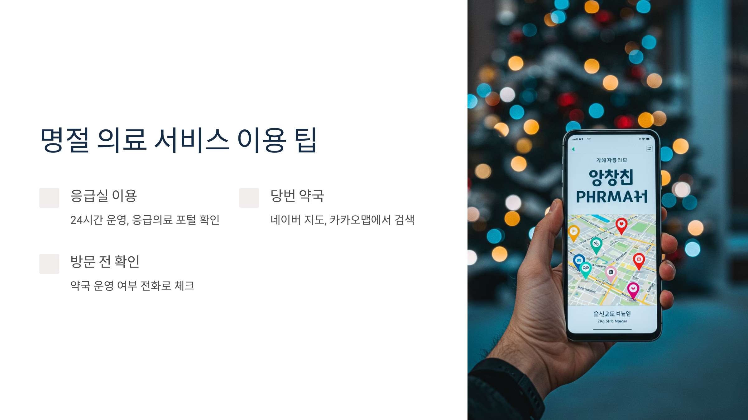 - 네이버 지도, 카카오맵에서 "명절 약국"을 검색하면 지역별 운영 약국을 찾을 수 있습니다.