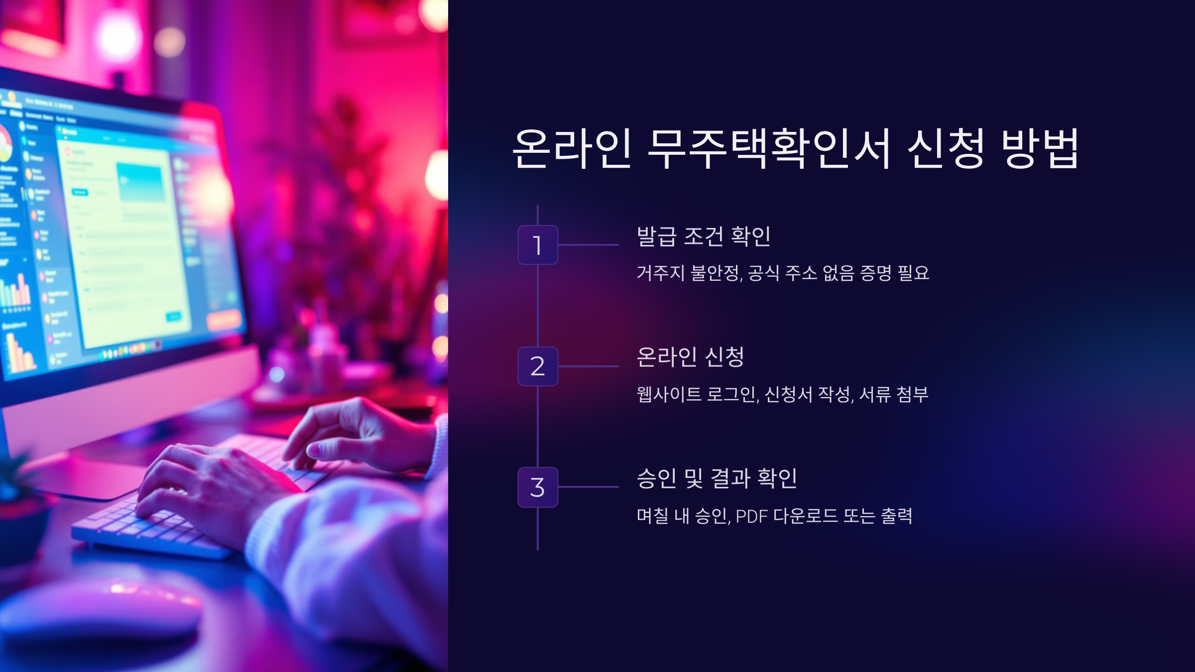 온라인으로 무주택확인서를 발급받기 위해서는 해당 서비스 제공 웹사이트에 접속하여 신청서를 작성해야 합니다. 아래 단계에 따라 간단하게 무주택확인서 신청이 가능합니다.