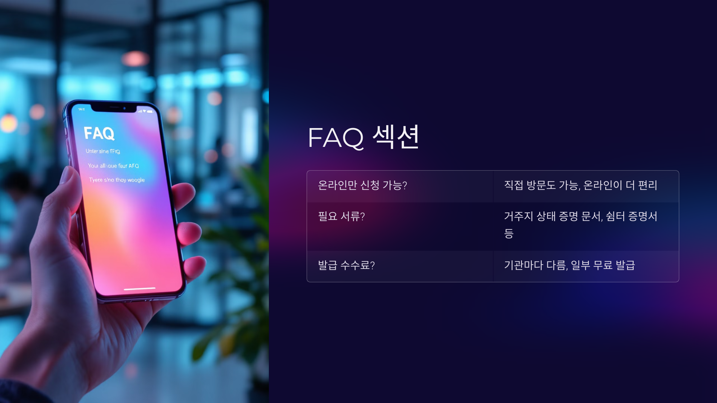 온라인 무주택확인서 발급은 간편한 절차와 간단한 서류로 신청할 수 있어 유용합니다. 홈리스 상태를 증명하여 필요한 도움을 원활하게 받을 수 있는 방법을 익혀두면, 어려운 상황에서도 필요한 도움을 빠르게 받을 수 있습니다. 아래 FAQ에서는 자주 묻는 질문을 추가로 설명합니다.