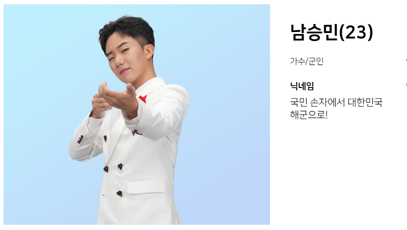 모델 출신으로, 무대에서의 카리스마와 독특한 음색으로 주목받고 있습니다. - 남승민 (23세)