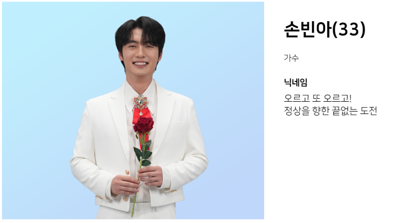 최연소 참가자 중 하나로, 트로트의 미래를 짊어질 차세대 스타로 평가받고 있습니다. - 손빈아 (33세)