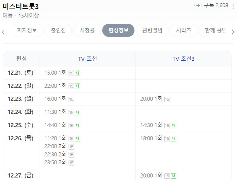 미스터트롯3의 재방송 시간은 다음과 같습니다: