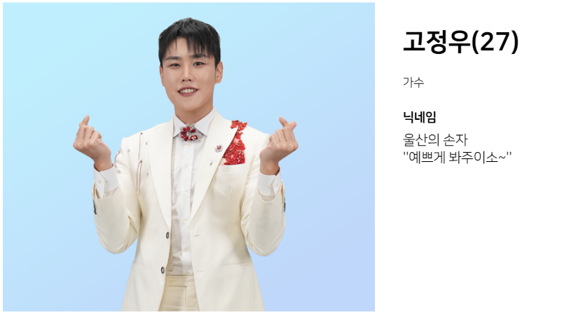 대한민국 최초의 시니어 모델로, 나이를 뛰어넘는 열정과 트로트에 대한 진심을 보여줍니다. - 고정우 (26세)