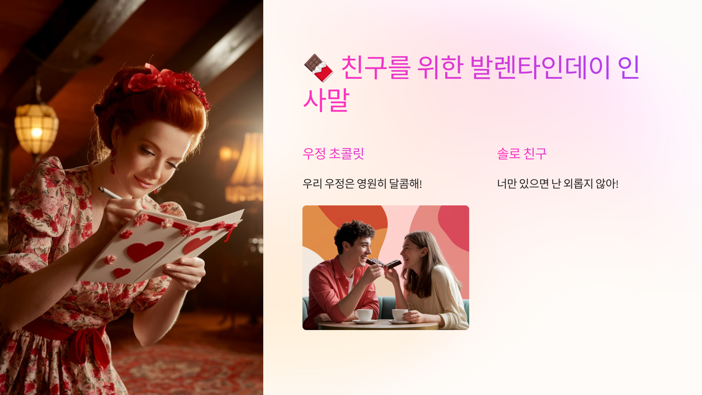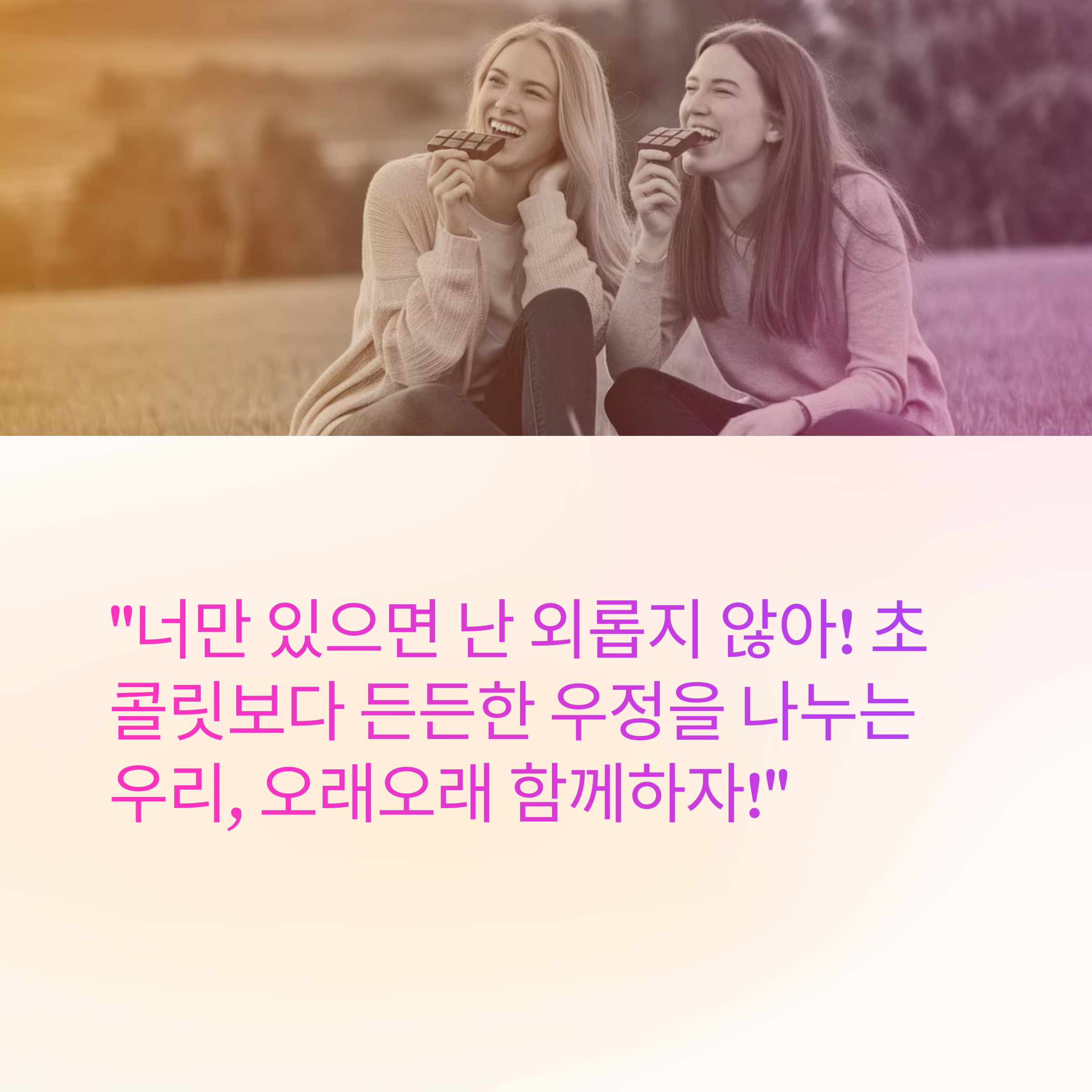 ✔️ "너만 있으면 난 외롭지 않아! 초콜릿보다 든든한 우정을 나누는 우리, 오래오래 함께하자!"