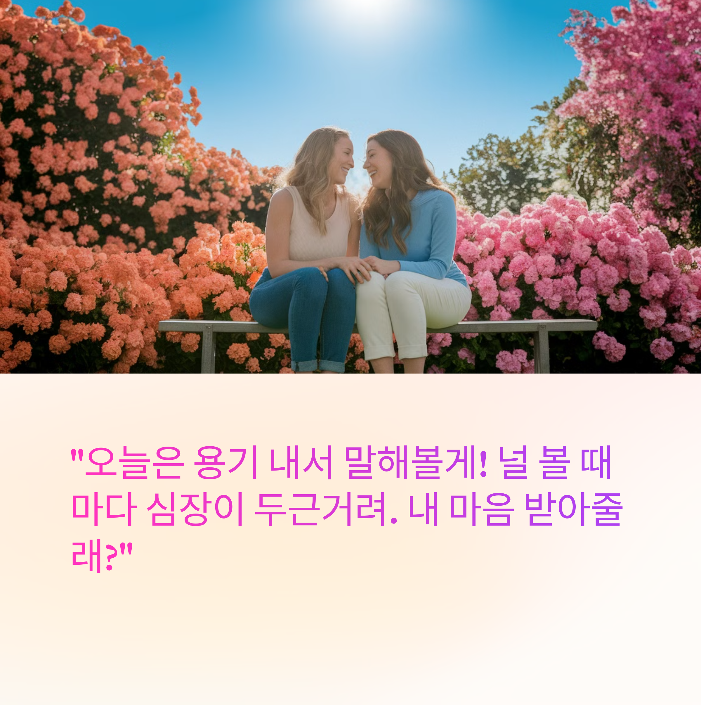 ✔️ "오늘은 용기 내서 말해볼게! 널 볼 때마다 심장이 두근거려. 내 마음 받아줄래?"
