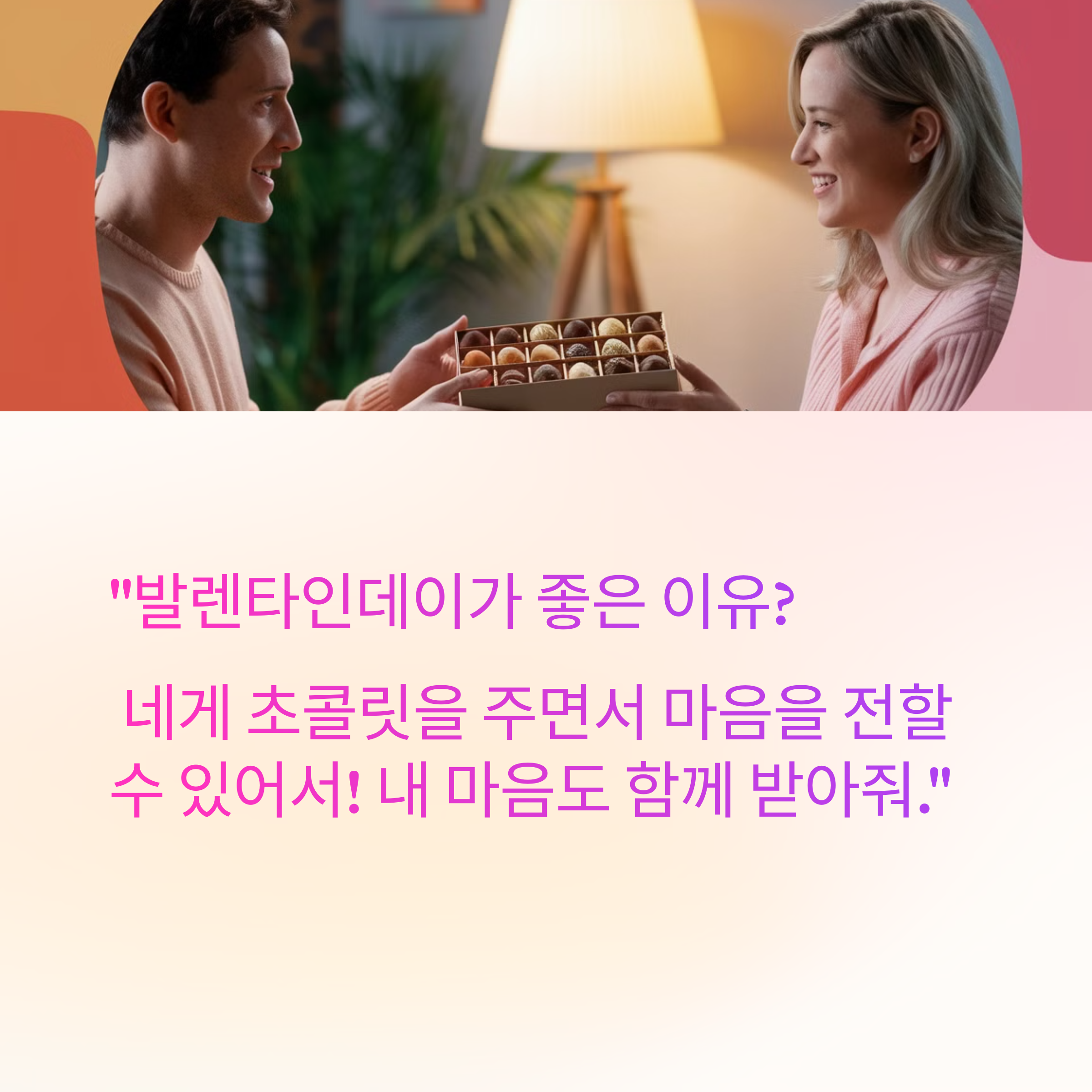✔️ "발렌타인데이가 좋은 이유? 네게 초콜릿을 주면서 마음을 전할 수 있어서! 내 마음도 함께 받아줘."