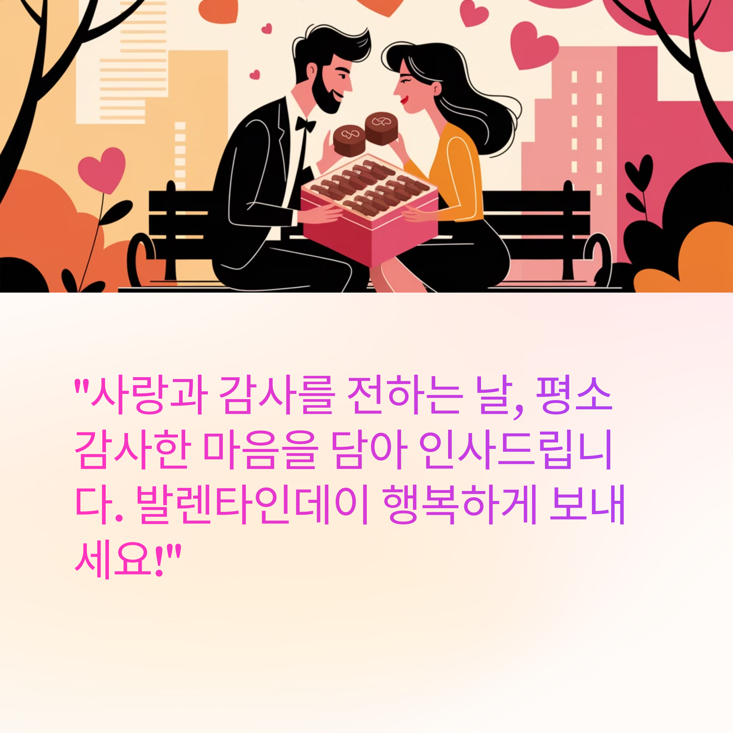 ✔️ "사랑과 감사를 전하는 날, 평소 감사한 마음을 담아 인사드립니다. 발렌타인데이 행복하게 보내세요!"