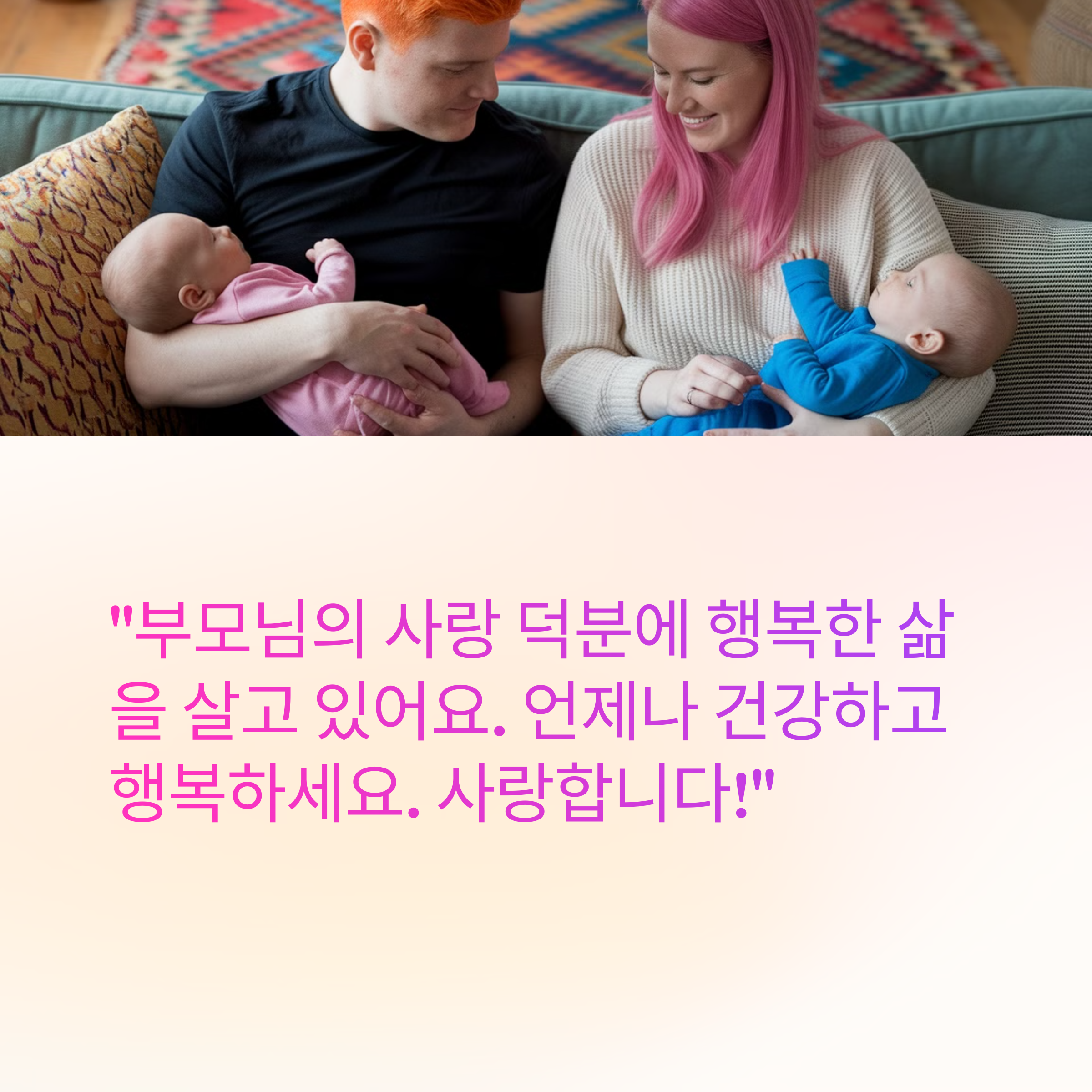 ✔️ "부모님의 사랑 덕분에 행복한 삶을 살고 있어요. 언제나 건강하고 행복하세요. 사랑합니다!"