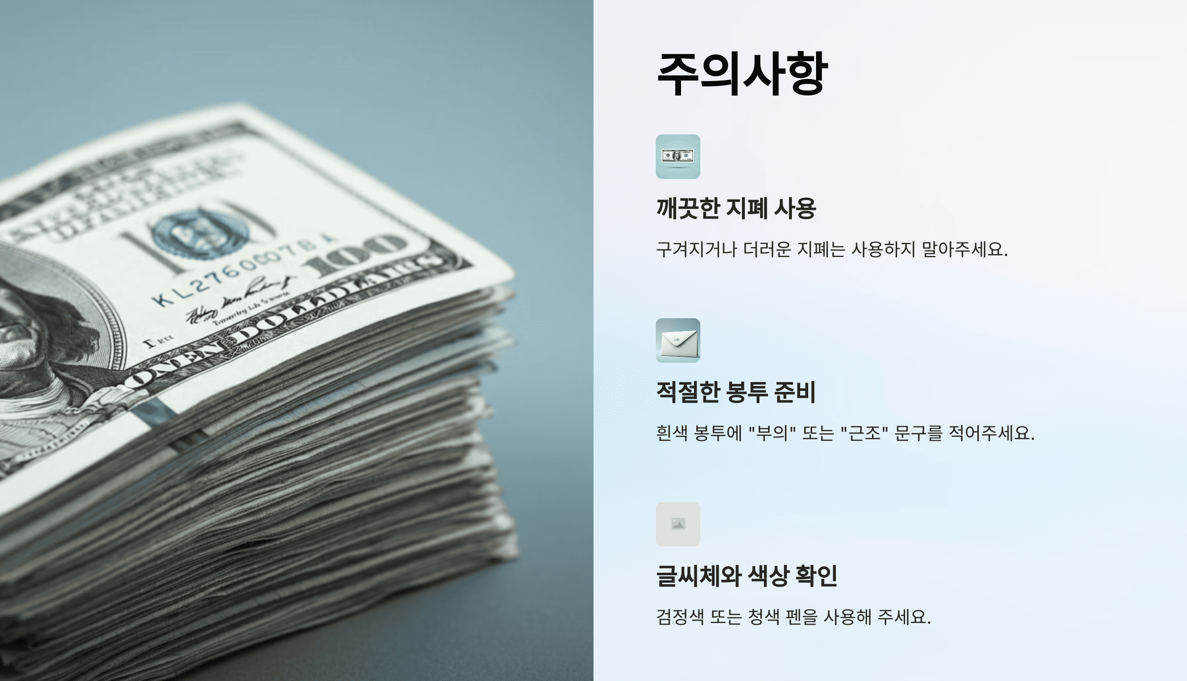 - 금액: 깨끗한 지폐를 준비합니다.