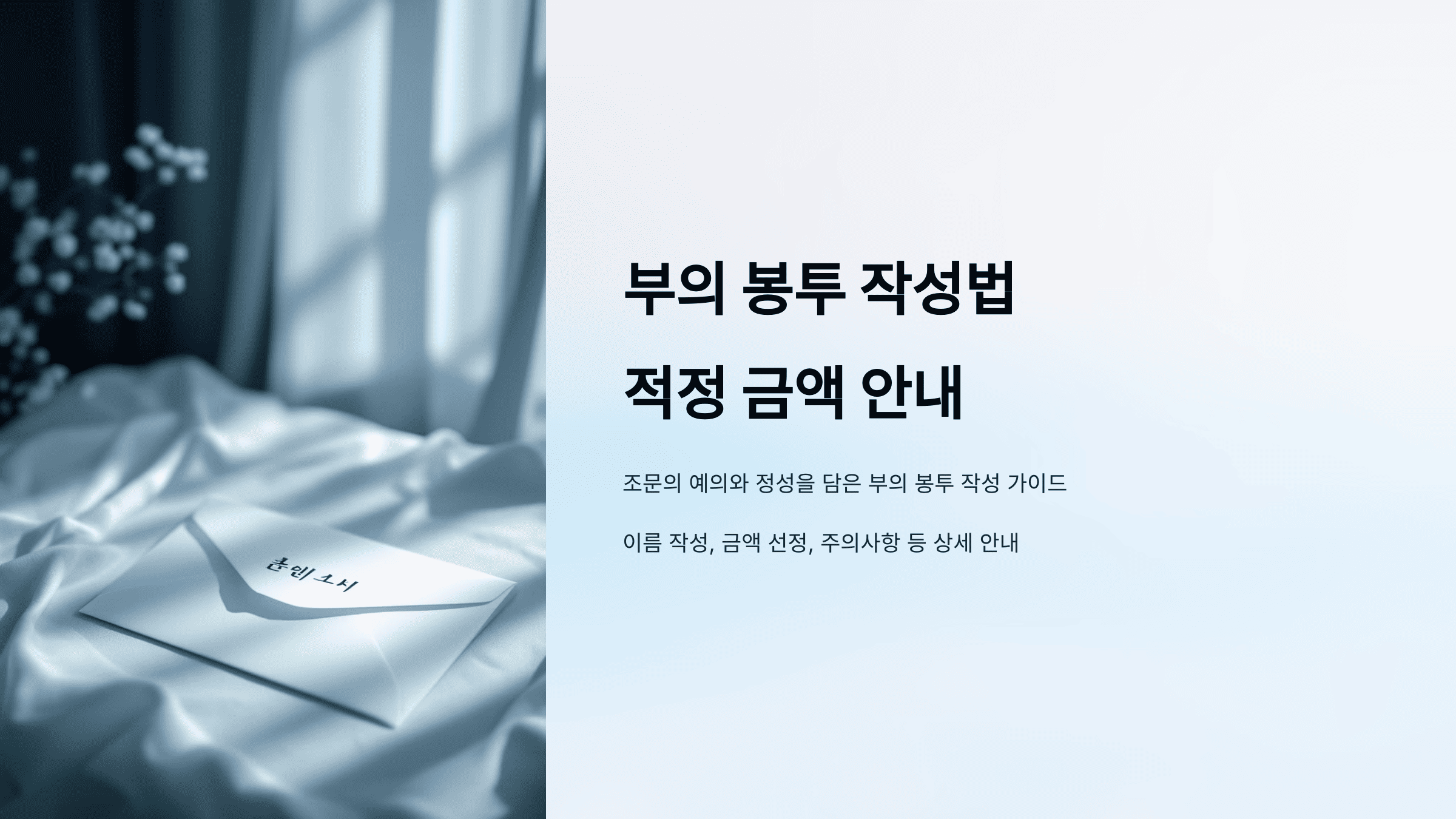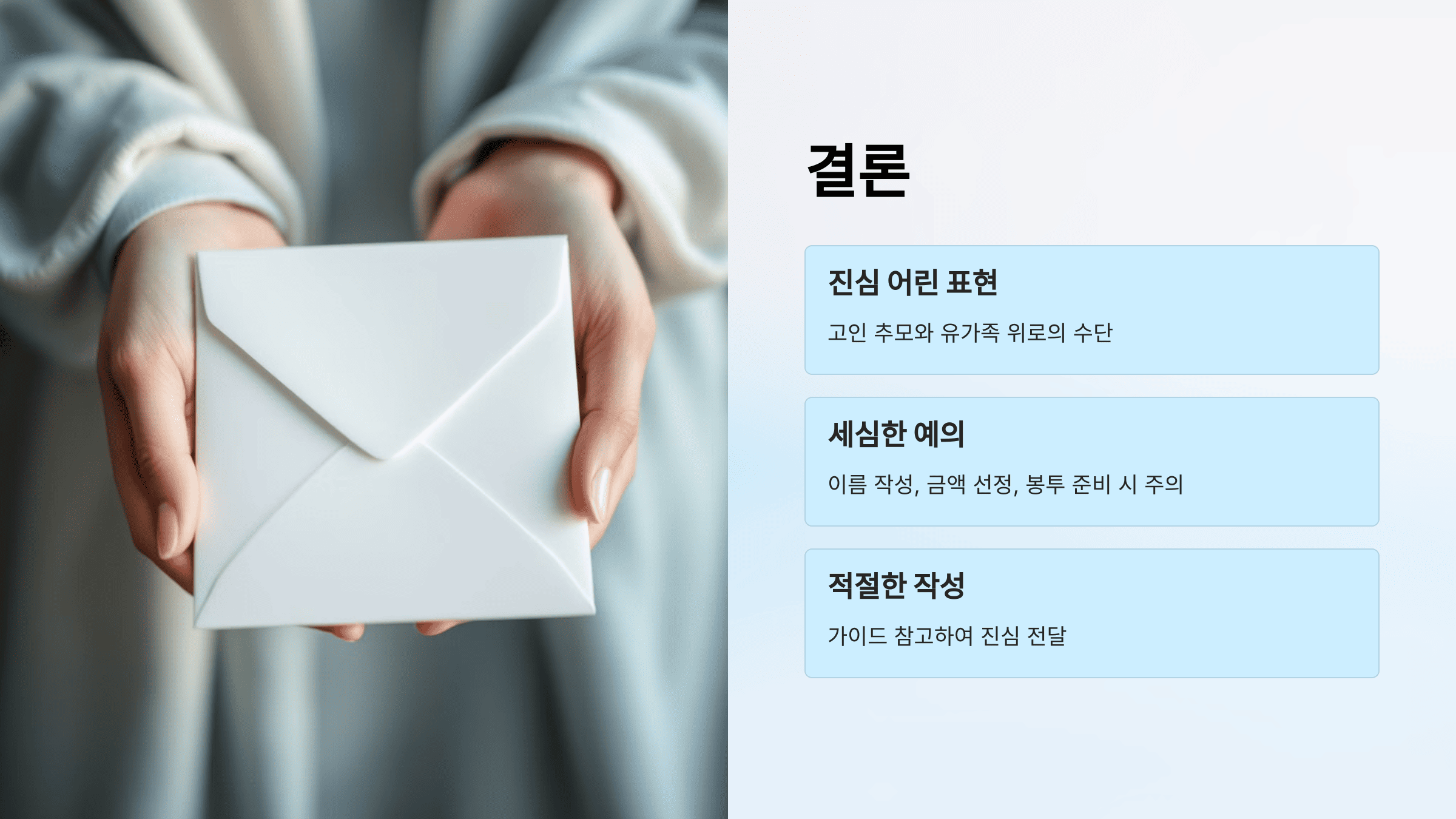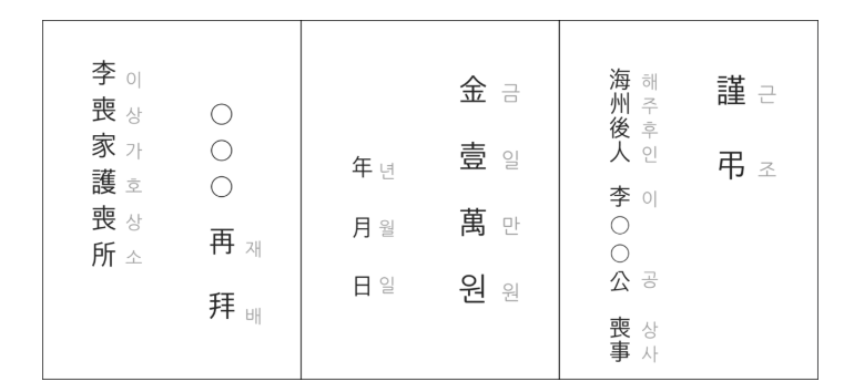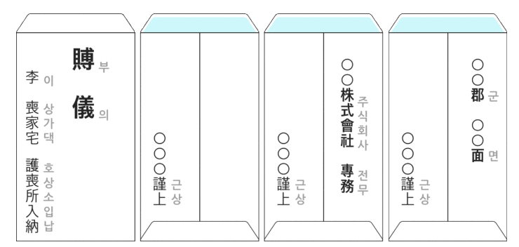 - 일반적인 흰색 봉투를 사용하며, 봉투에 "부의"나 "근조"와 같은 문구를 적습니다.