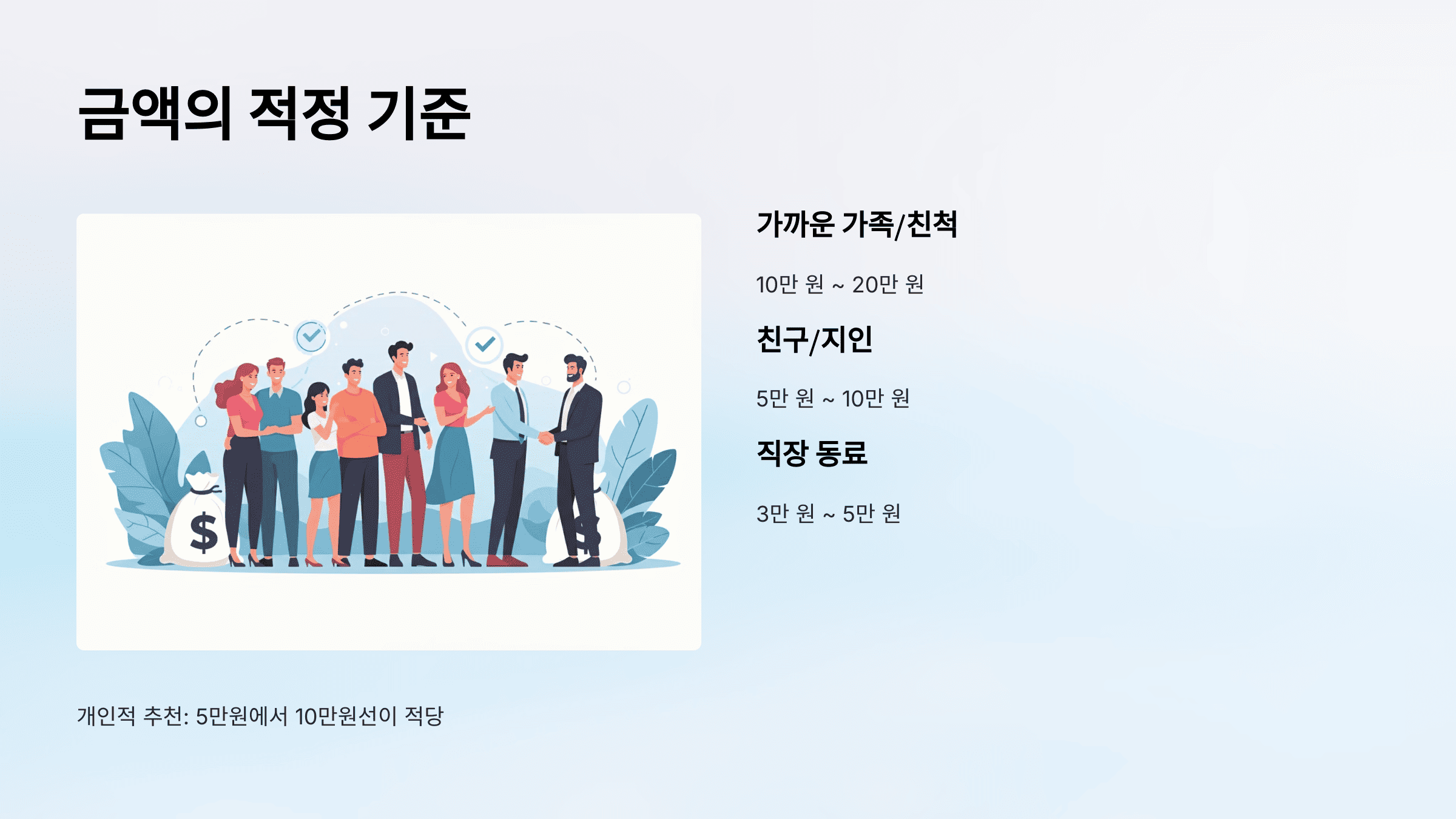 주의사항: 금액이 지나치게 많거나 적으면 부담을 줄 수 있으니, 상황에 맞는 적정선을 유지하세요.