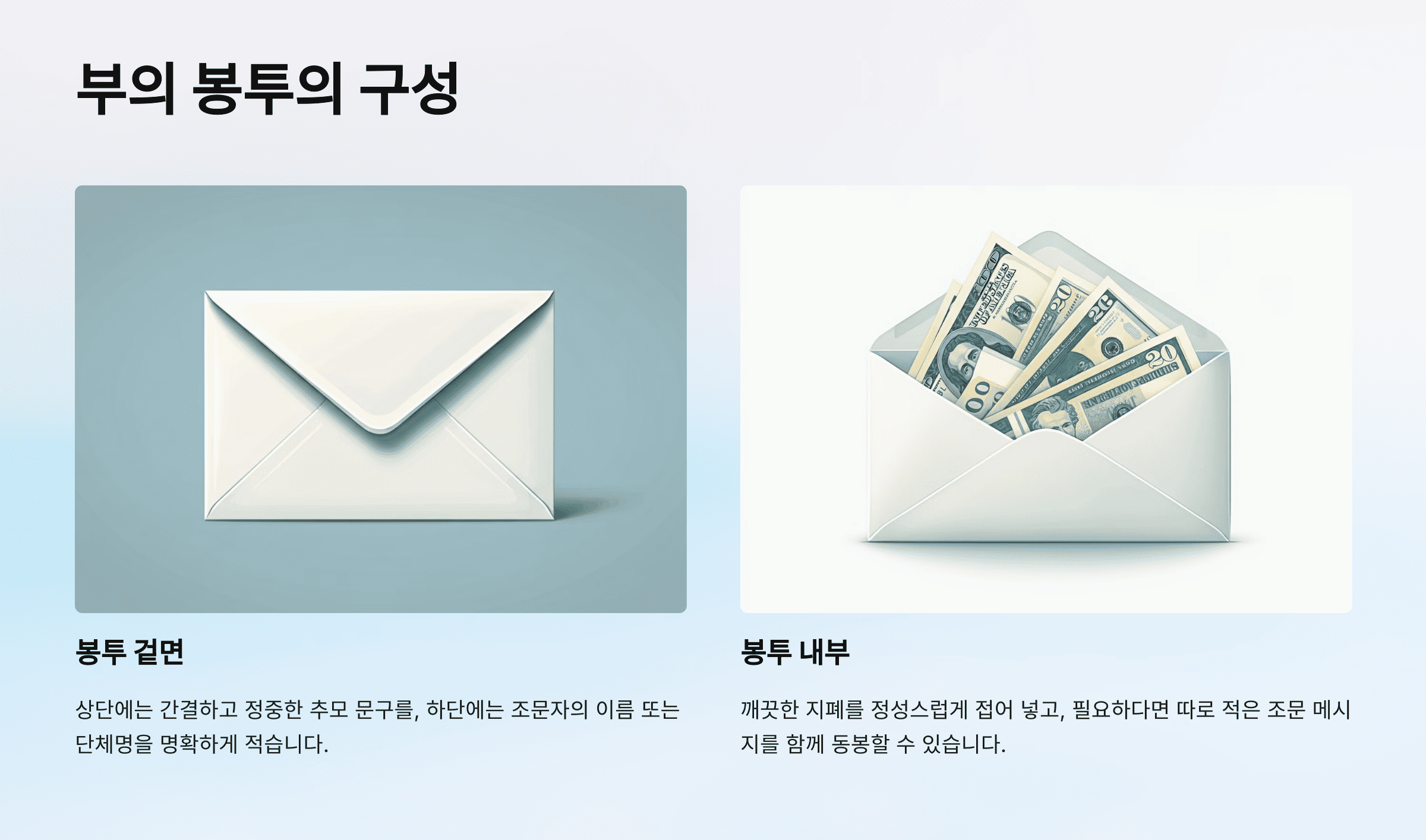 - 봉투 겉면에 금액을 적지 않으며, 금액은 내부에만 포함합니다.