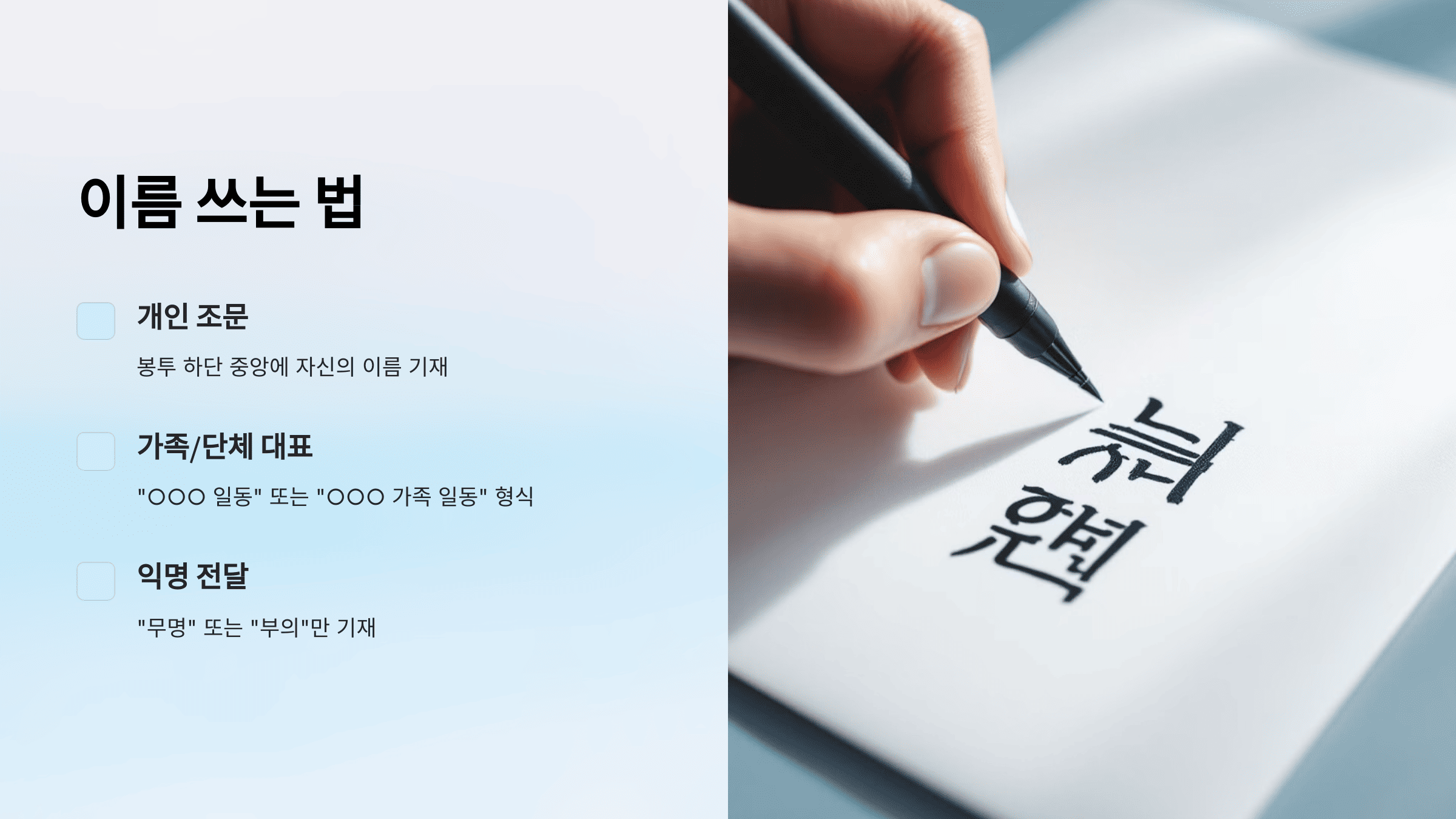 - 글씨는 정갈하고 또렷하게 쓰며, 붓펜이나 검정 펜을 사용하는 것이 예의입니다.