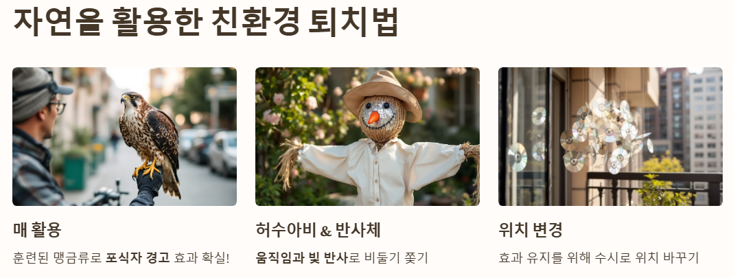 💡 매 모양의 모형 허수아비가 특히 효과적입니다.