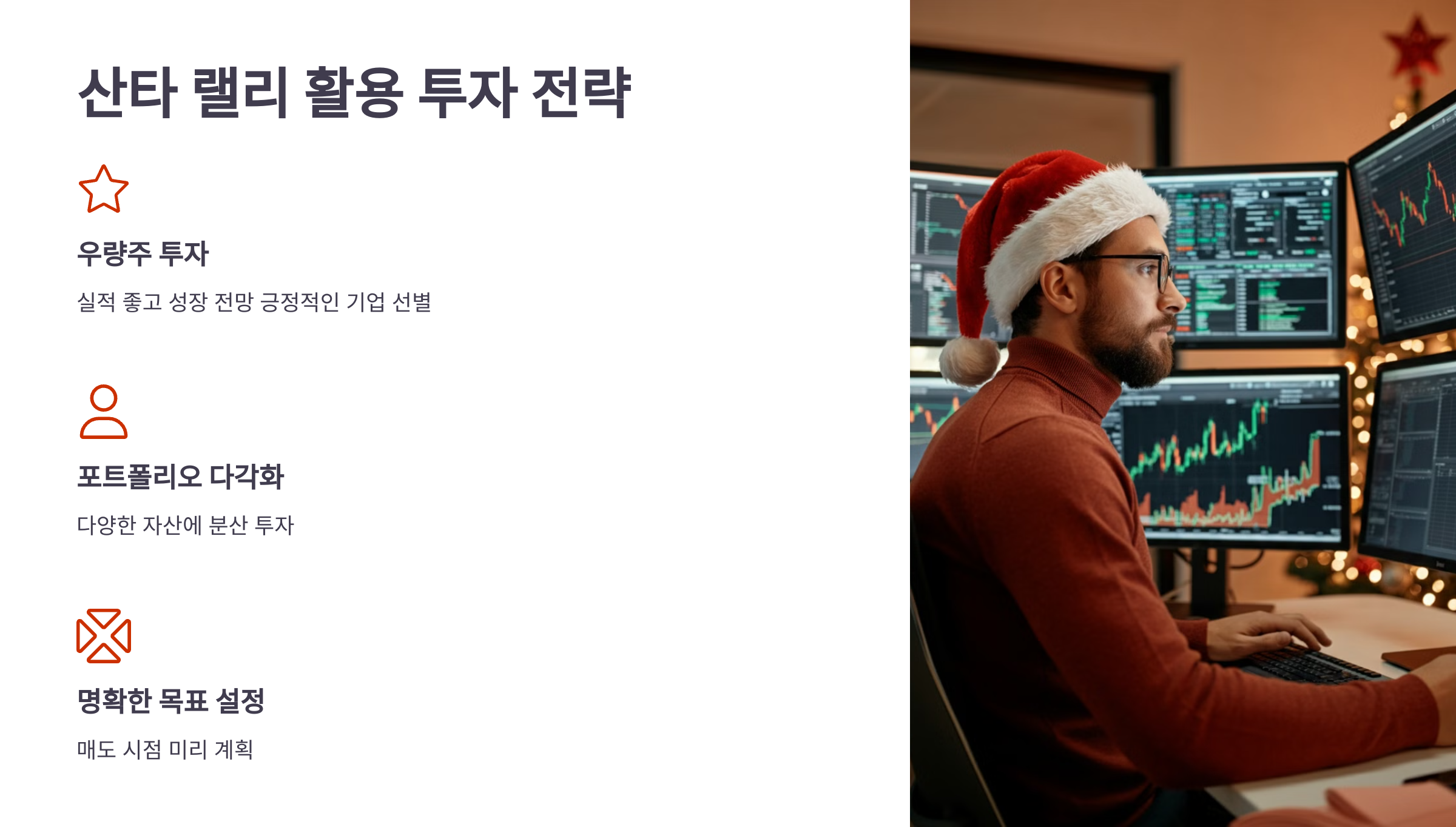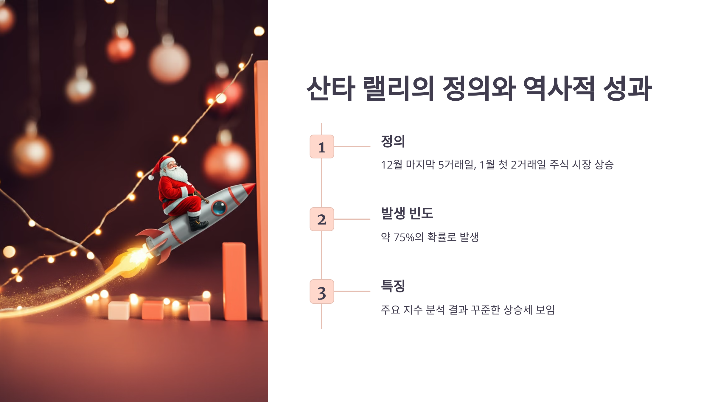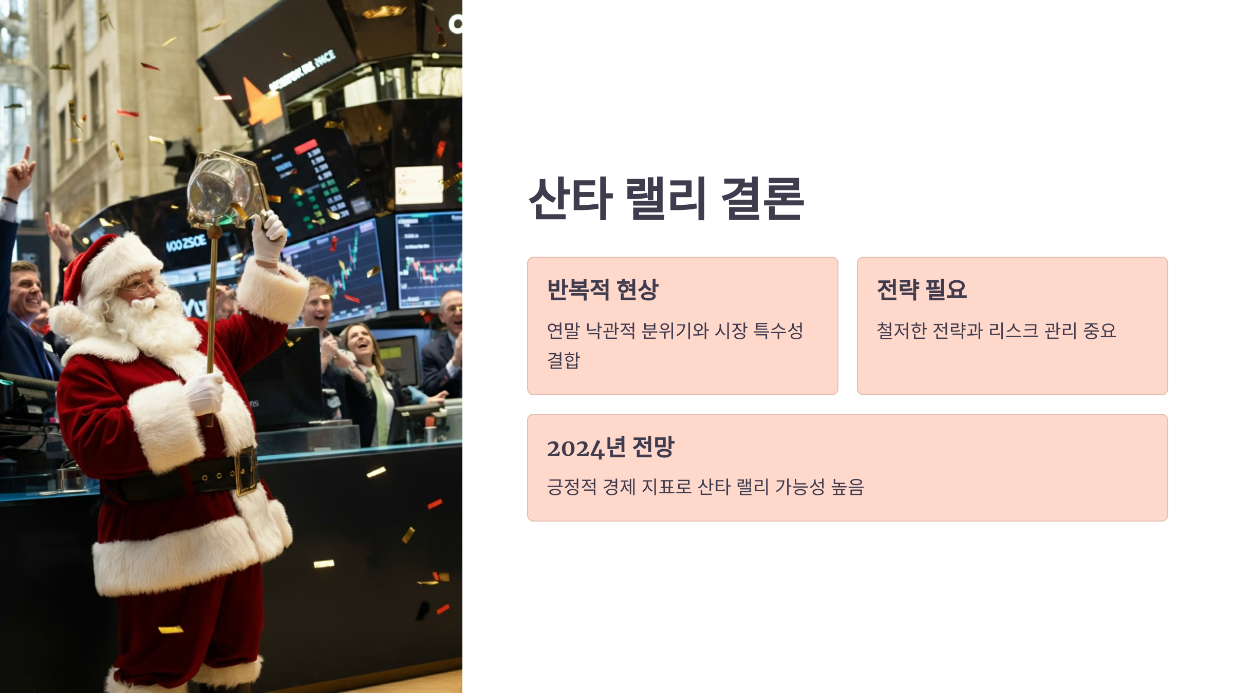 산타 랠리는 연말의 낙관적인 분위기와 시장 특수성이 결합된 흥미로운 현상입니다. 주가 상승은 과거에도 반복적으로 나타났지만, 이를 활용하기 위해서는 철저한 전략과 리스크 관리가 필요합니다.