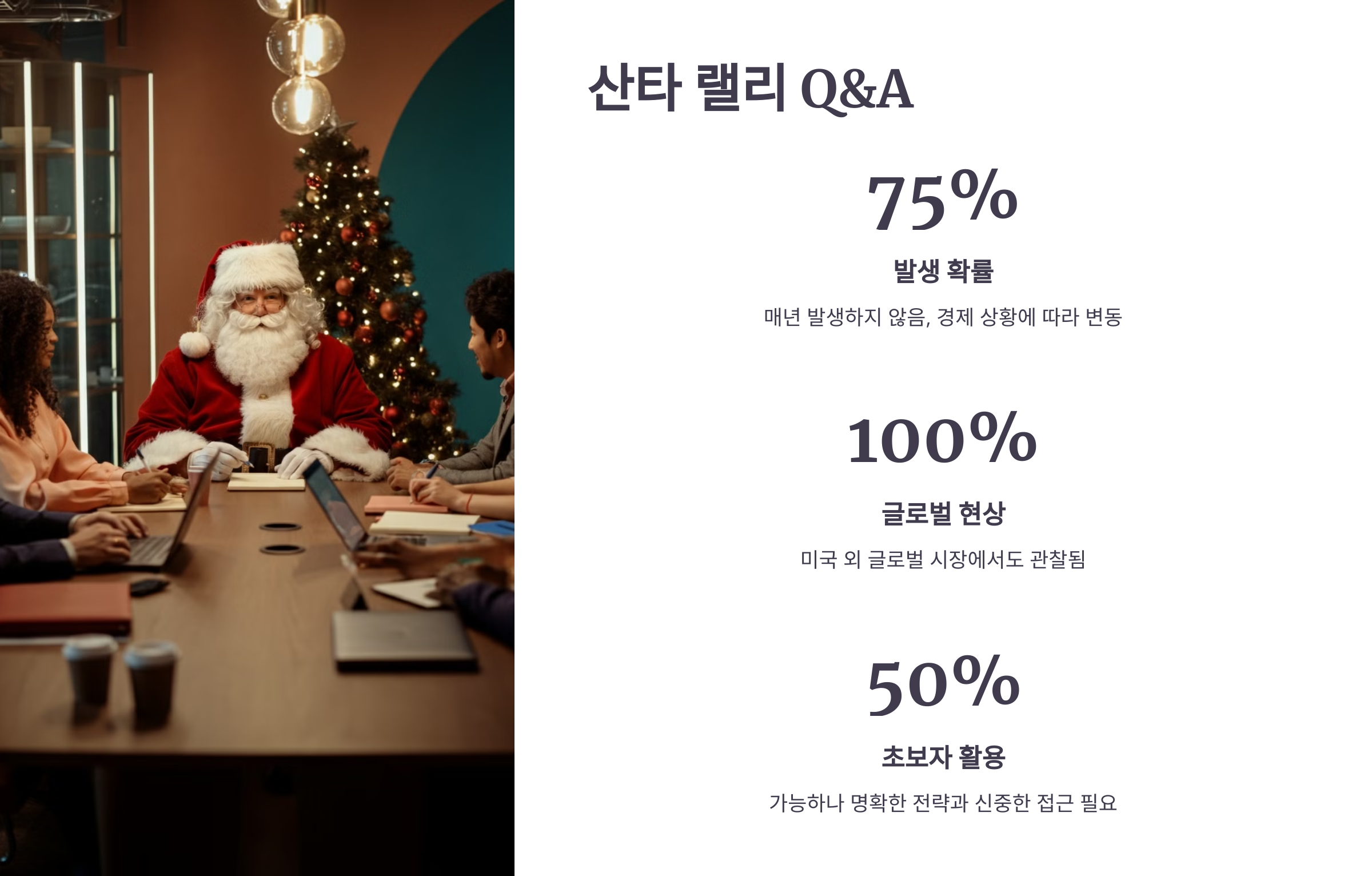 A1: 아닙니다. 산타 랠리는 약 75%의 확률로 발생했지만, 경제나 지정학적 상황에 따라 나타나지 않을 수도 있습니다.