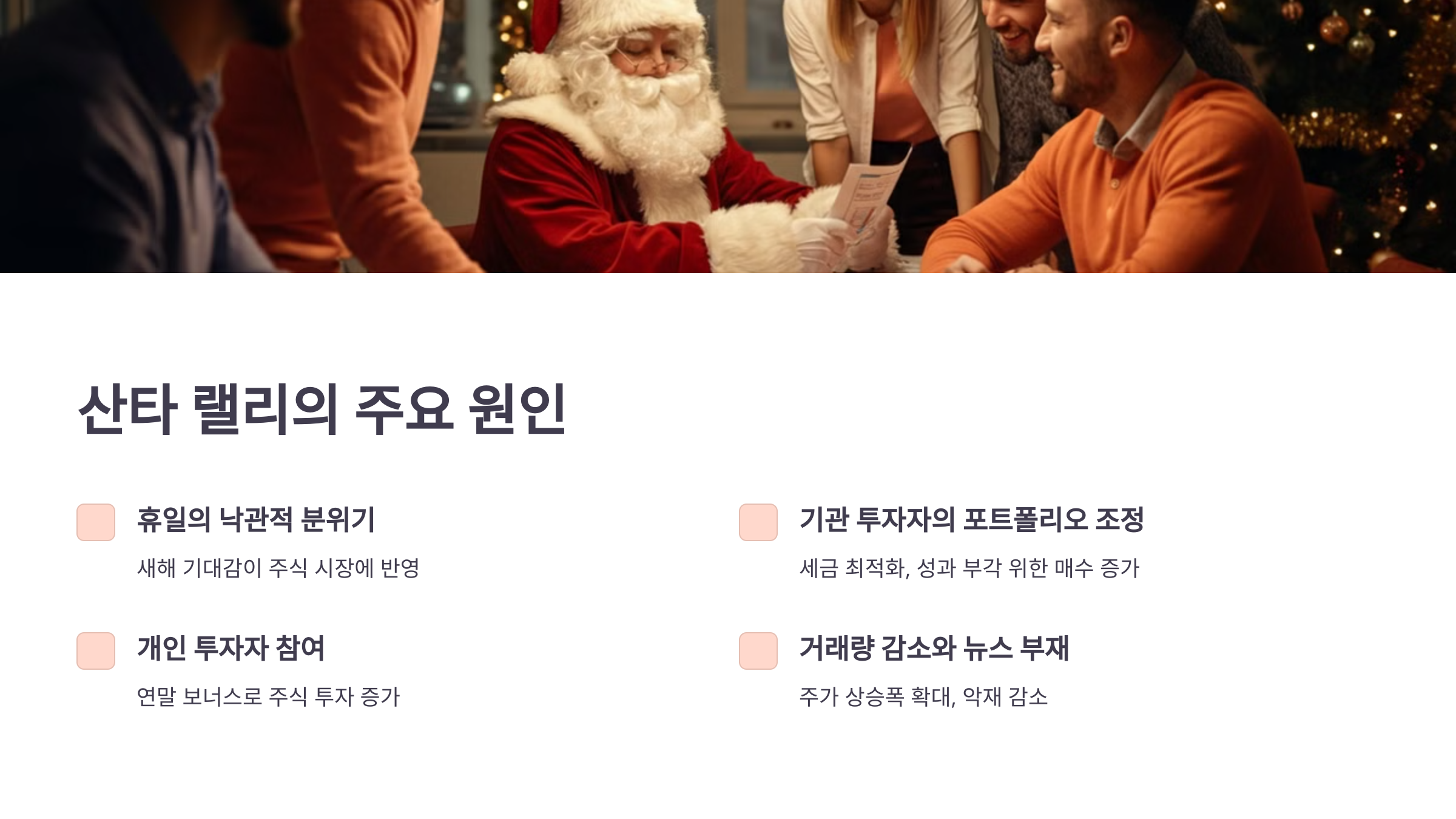 산타 랠리는 여러 요인이 결합되어 발생하는데요. 주요 원인은 다음과 같습니다.